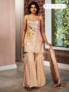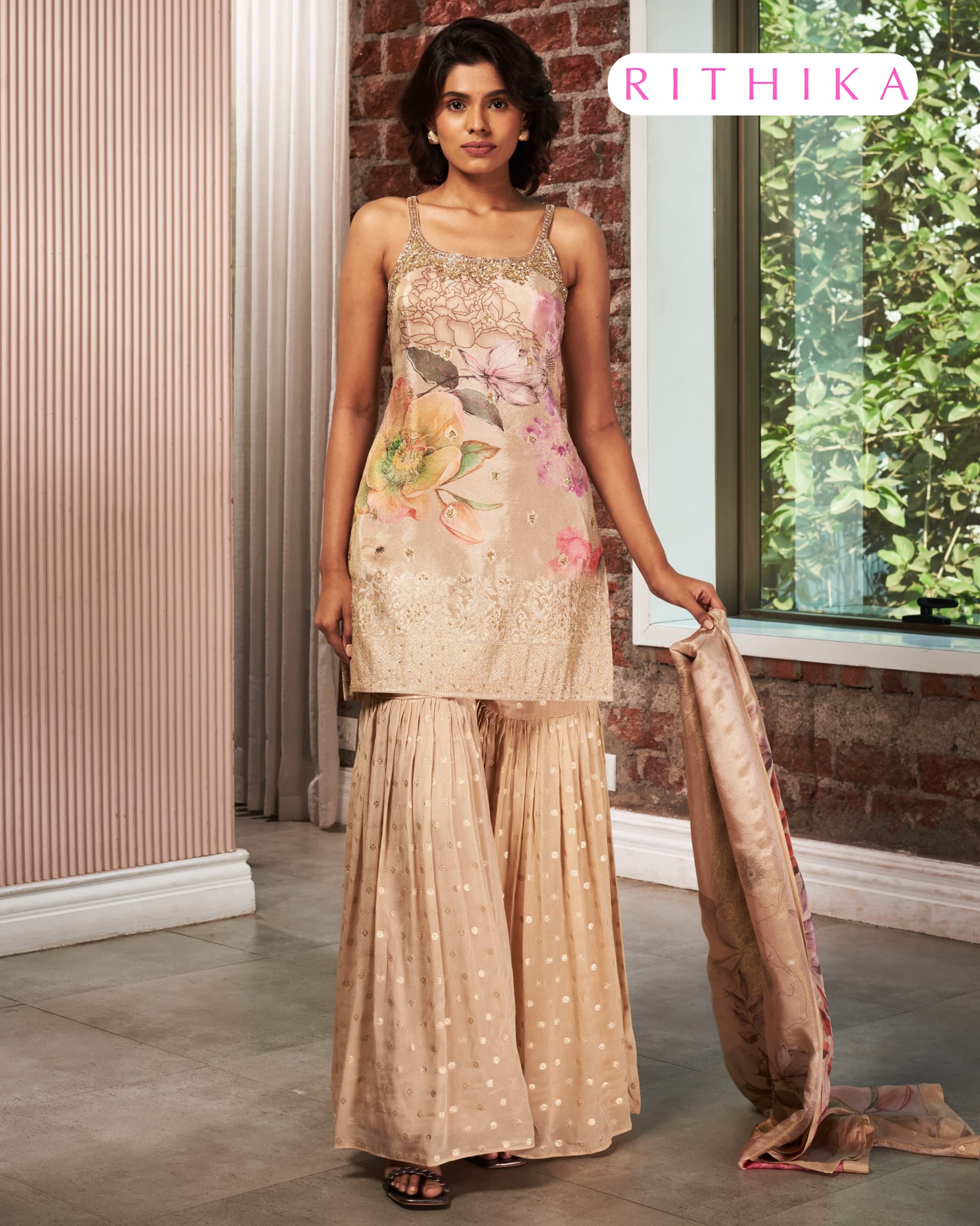 Light beige silk fabric sharara with all over woven buttas paired with a tissue silk floral printed short top with zarodosi and sequin work with a printed silk dupatta and 3/4th sleeves.