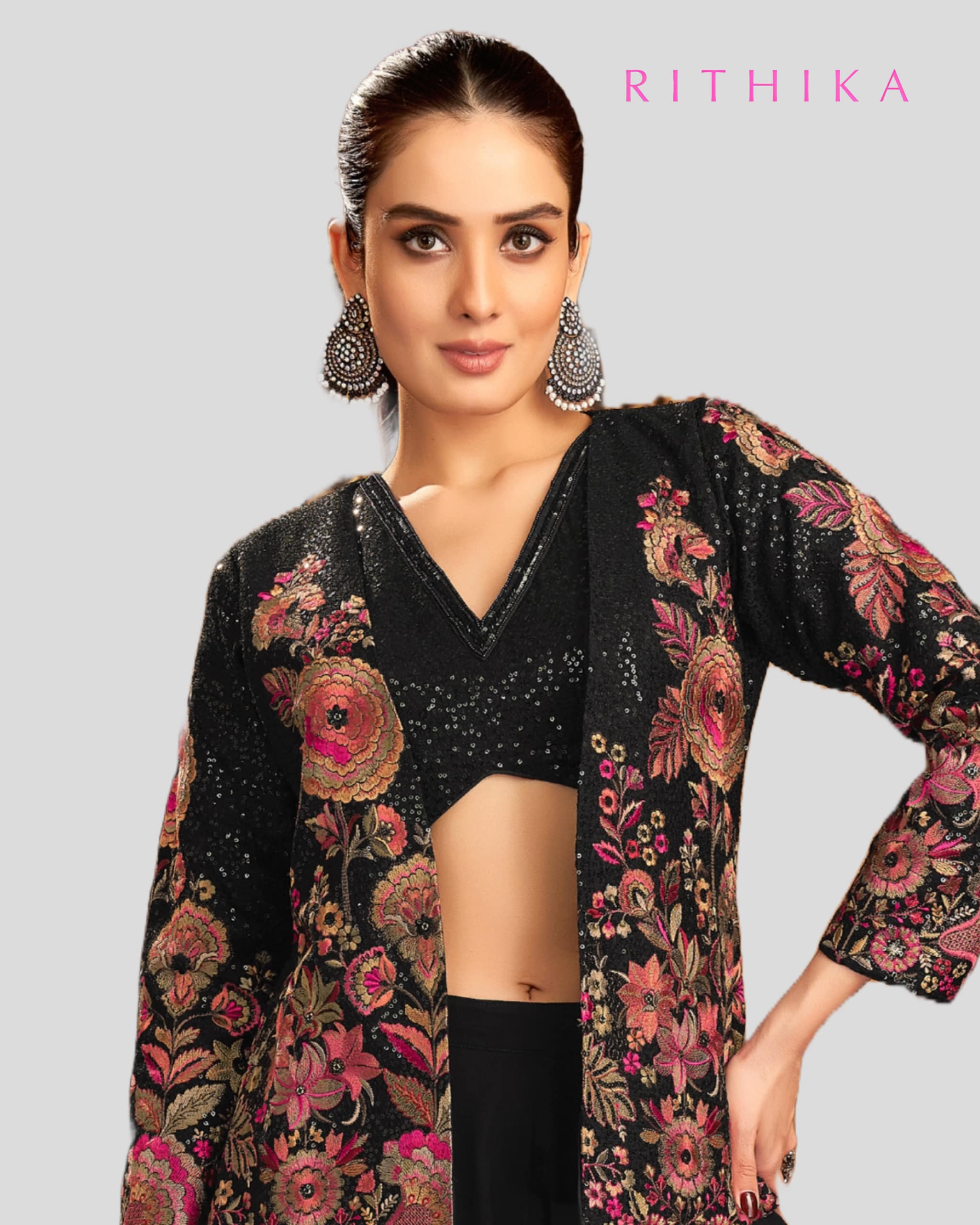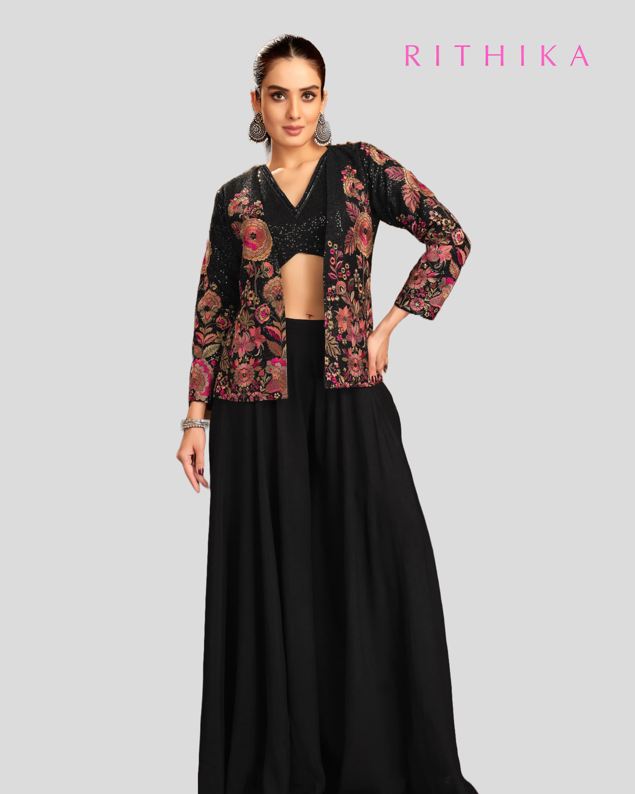 Black indo western out fit with georgette fabric palazzo pants, heavy sequin work crop top with a heavy thread embroidered short jacket with 3/4th sleeves.