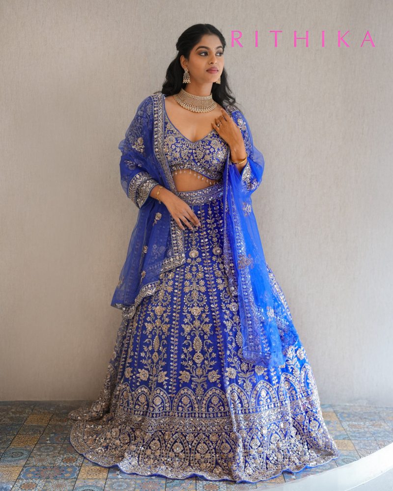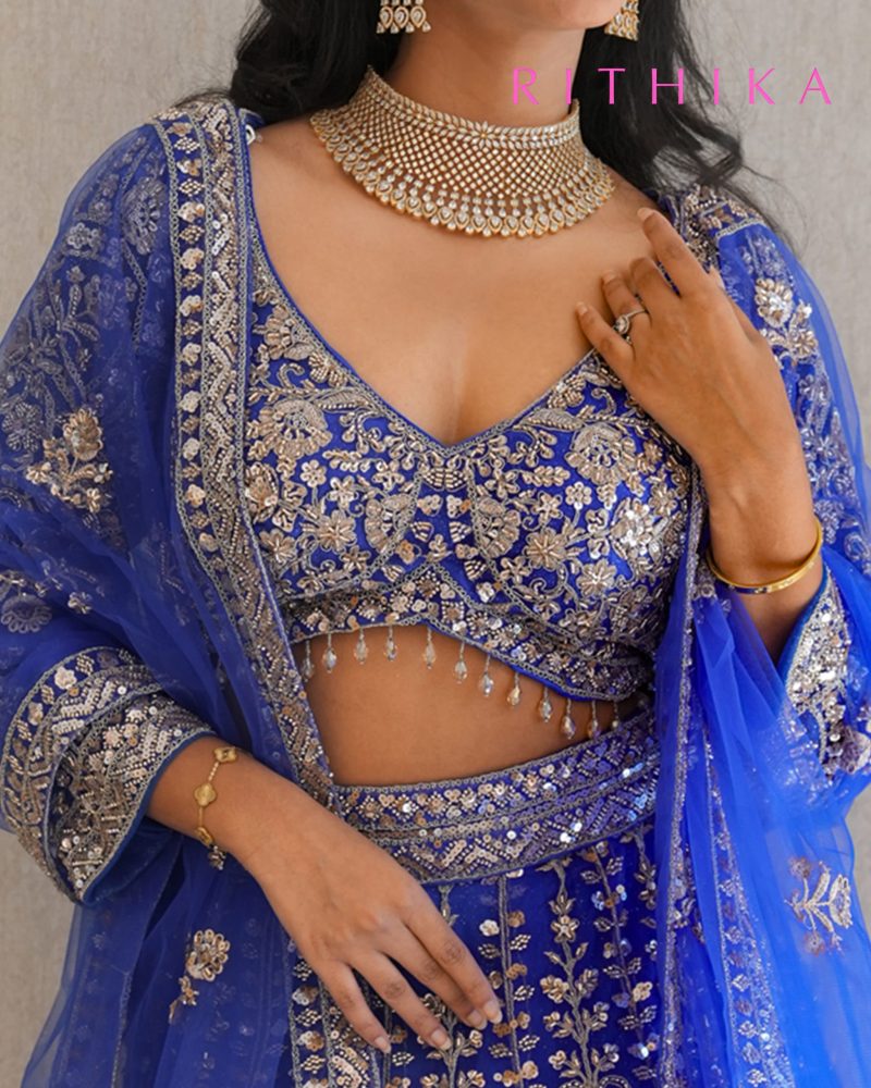 Blue net fabric lehenga with all over hand work, silk choli with heavy embroidery, net dupatta with3/4th sleeves.