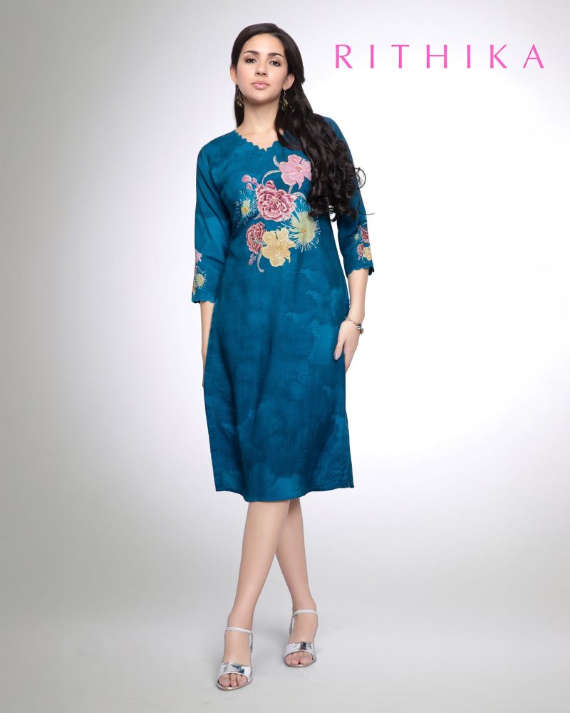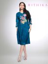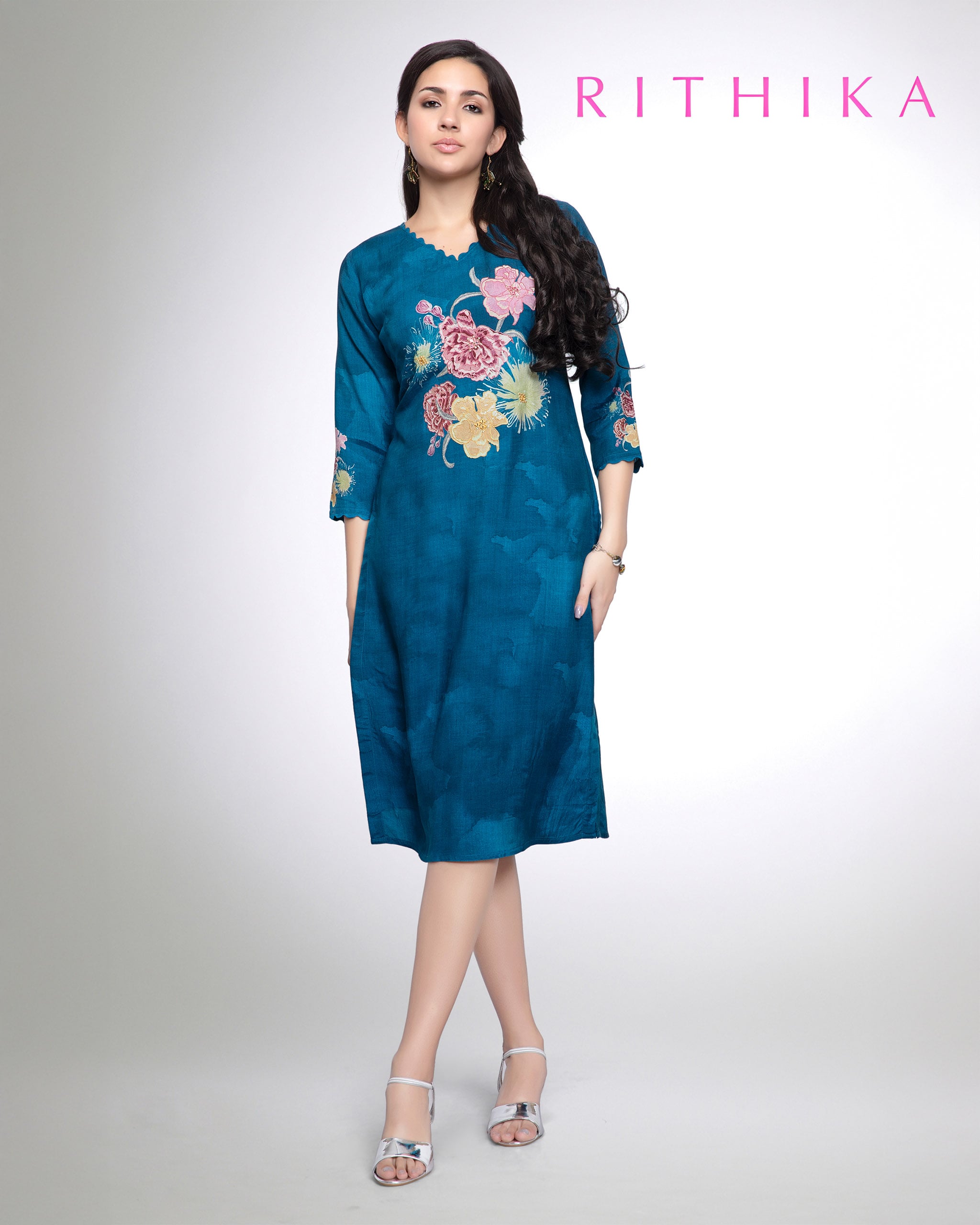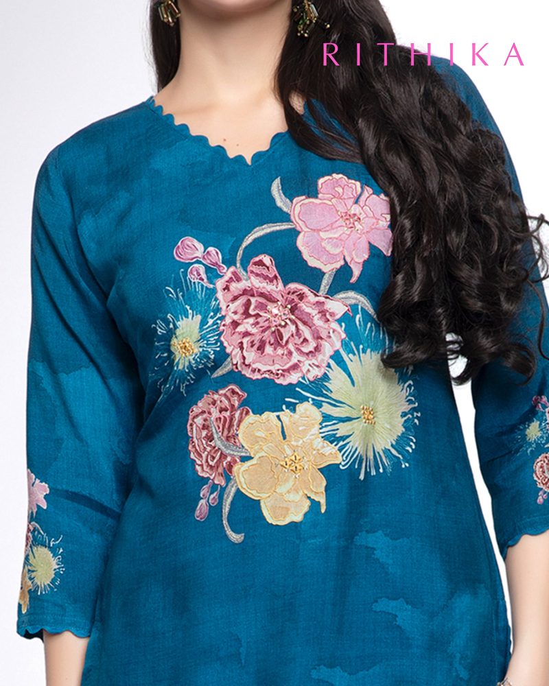 Blue muslin silk straight cut kurti with multi colored floral print highlighted with thread work, and 3/4th sleeves.