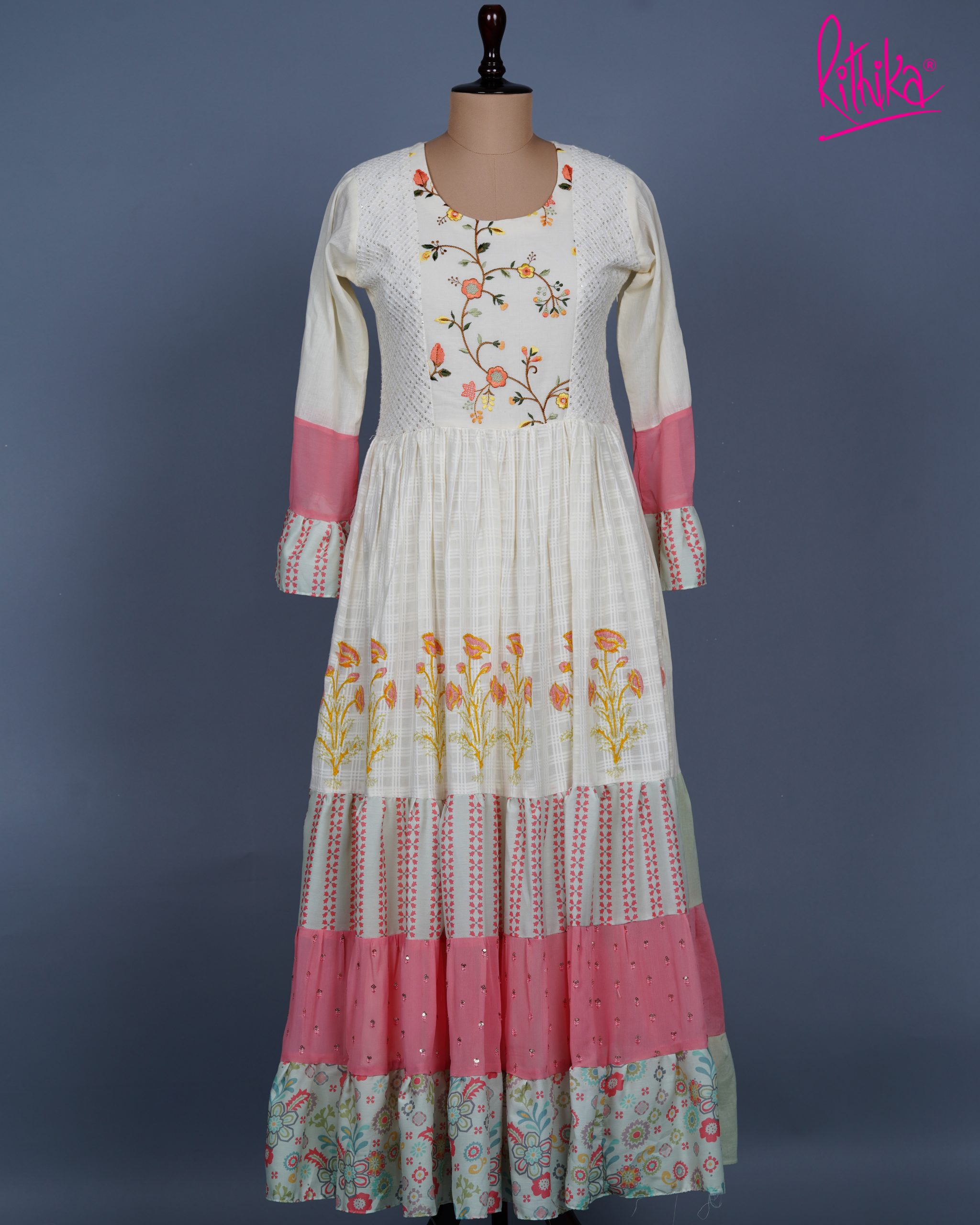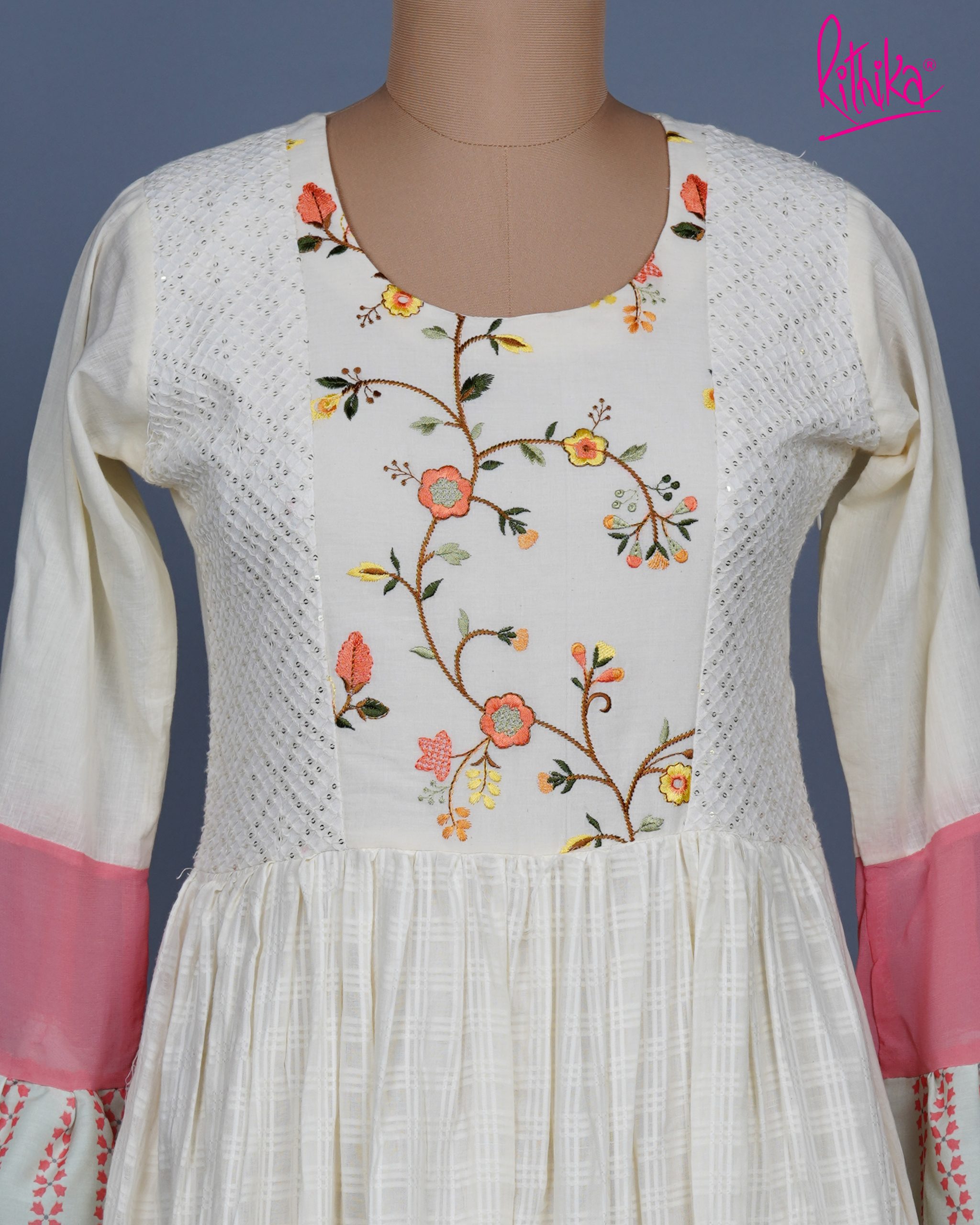 Cream chikankari anarkali kurti with lace and hand work on the neck and daman, with 3/4th sleeves.