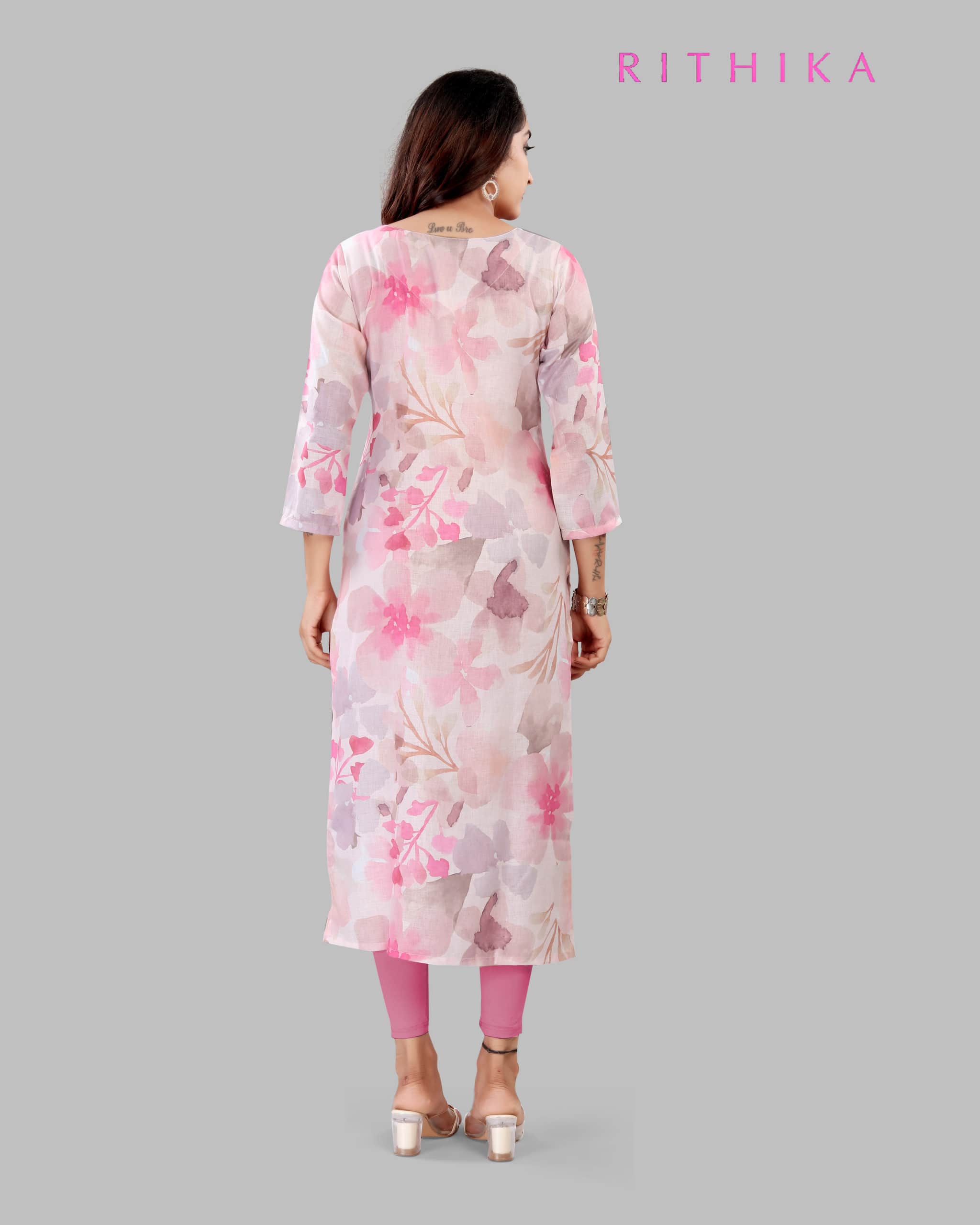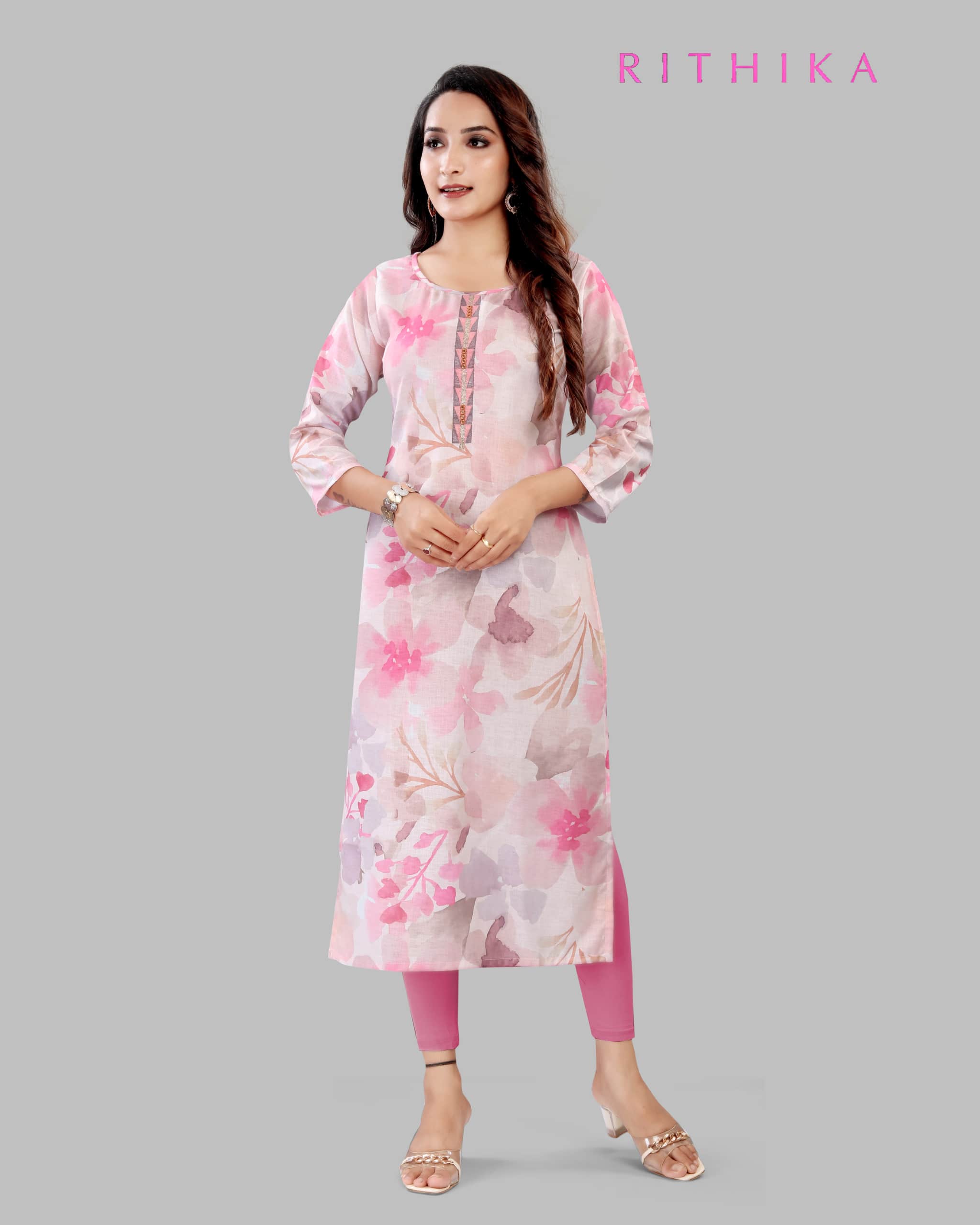 Cream and pink linen fabric straight cut kurti with all over floral print with thread and mirror work on the neck with 3/4th sleeves.