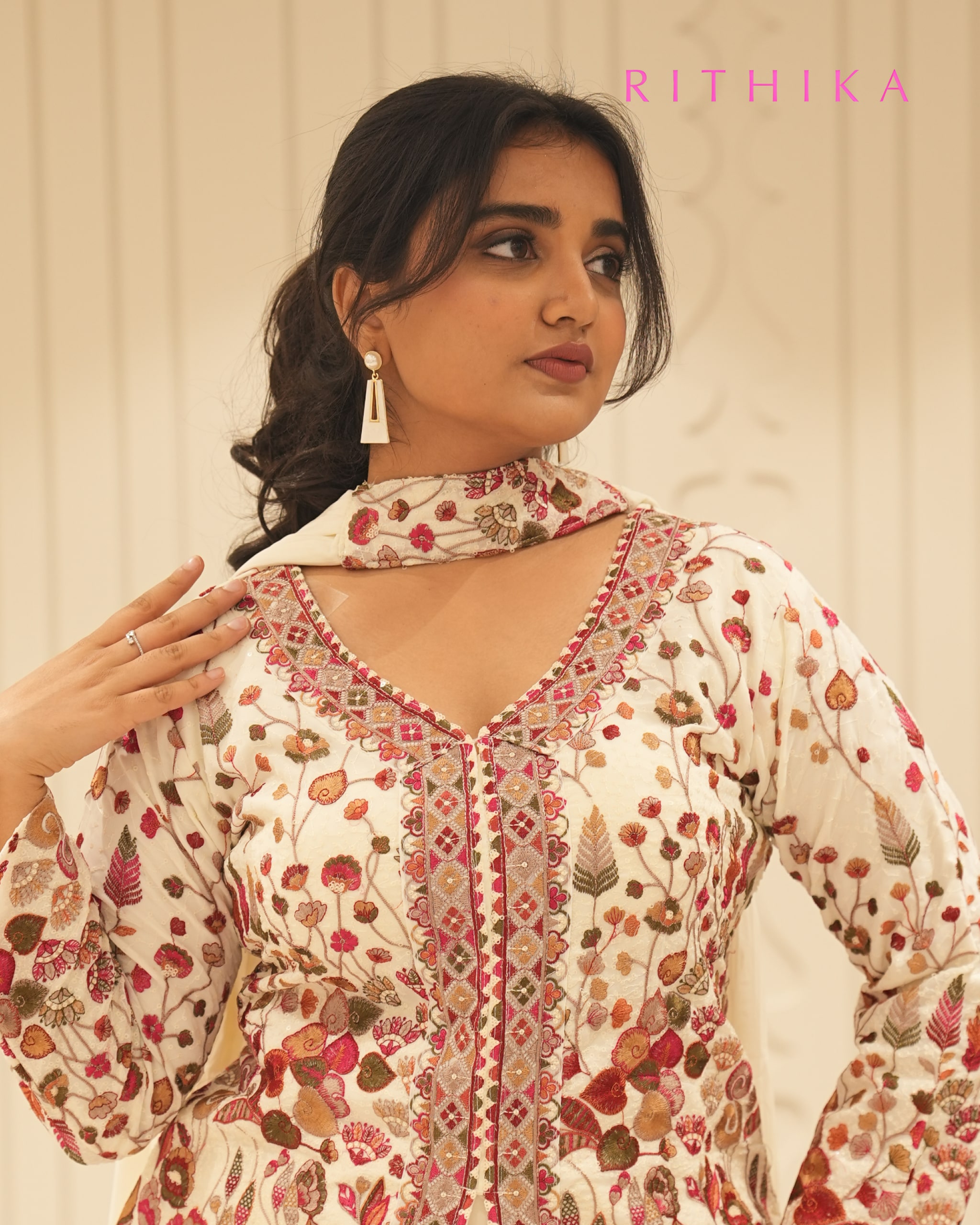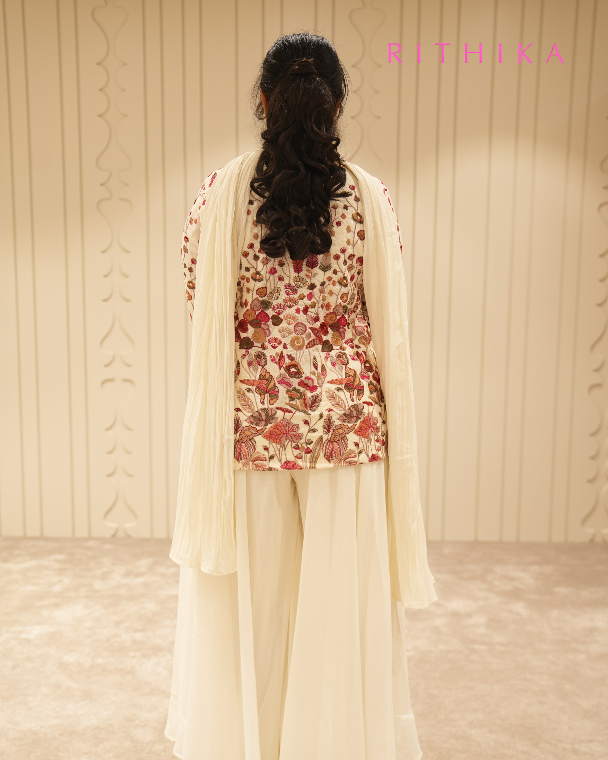Cream georgette fabric short top with heavy thread embroidery and sequin work paired with cream palazzo pants and a choker dupatta. Comes with full sleeves.
