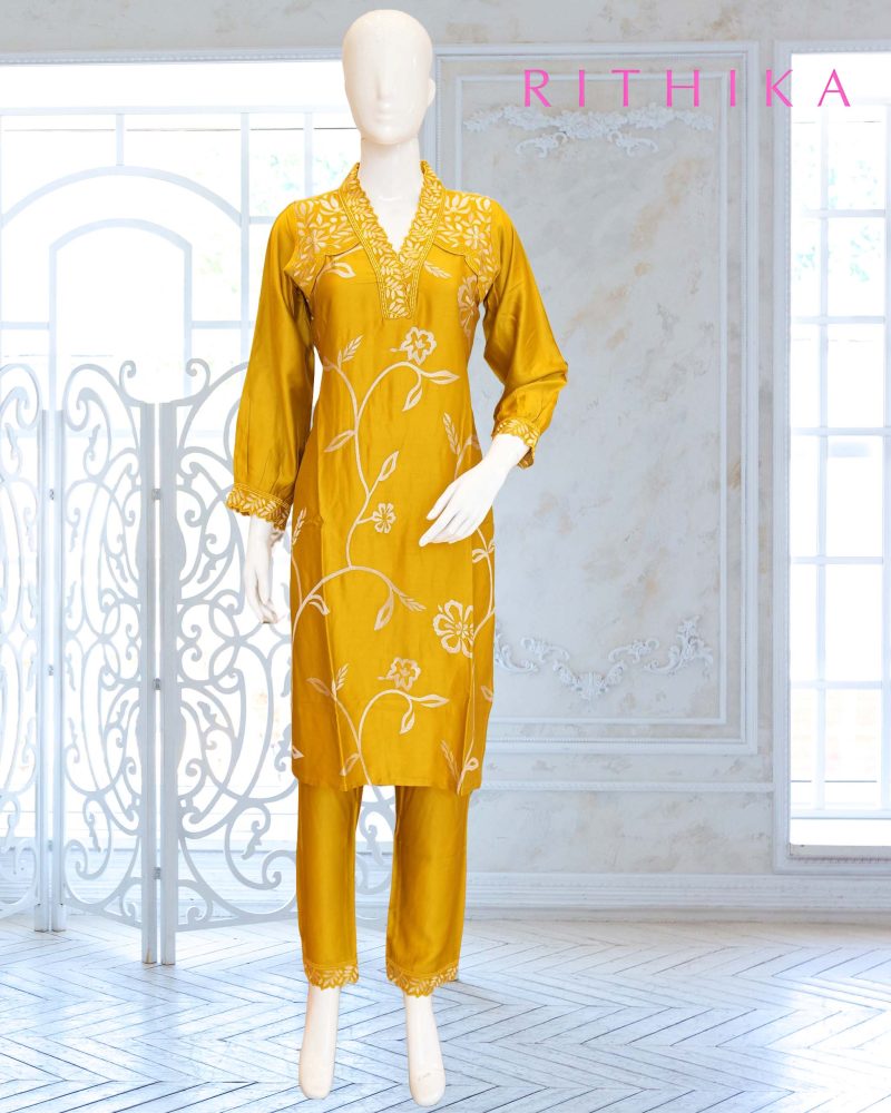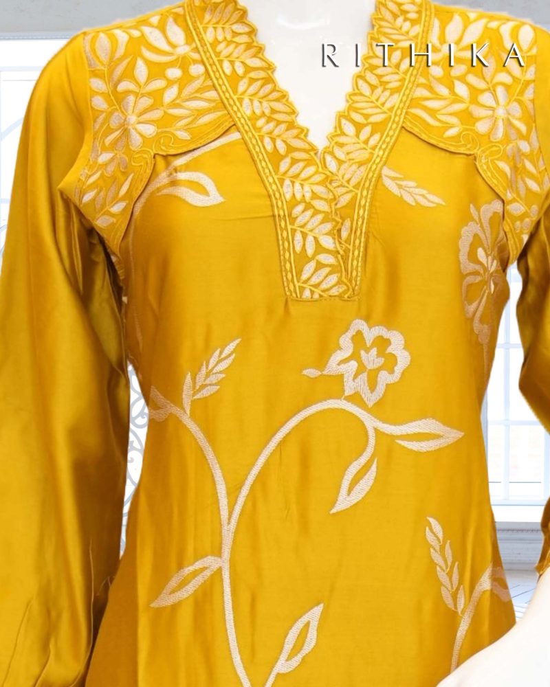 Golden yellow silk fabric co-ord set with all over thread embroidery with silk straight pants and 3/4th sleeves.