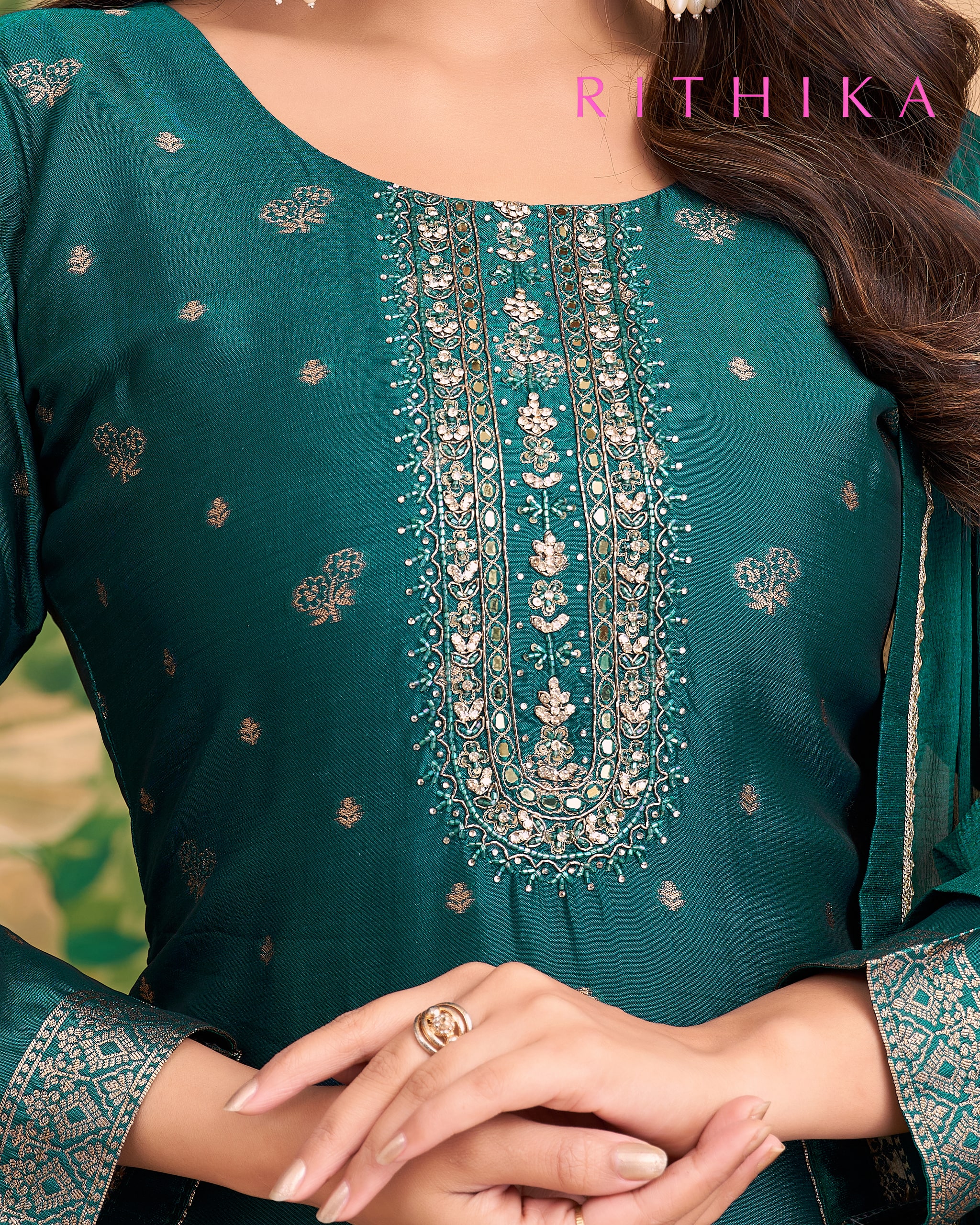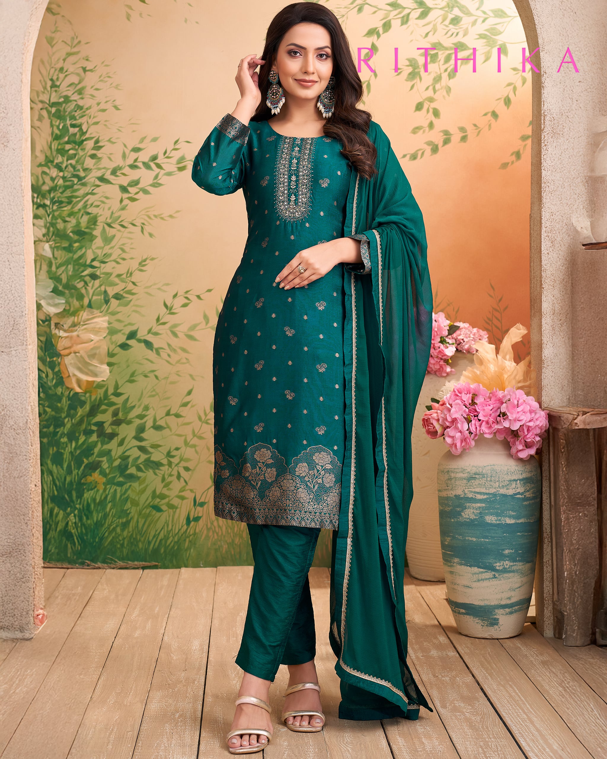 Green banaras silk straight cut with all over woven buttis, with hand work on the neck silk straight pants with a chiffon dupatta. Comes with3/4th sleeves.