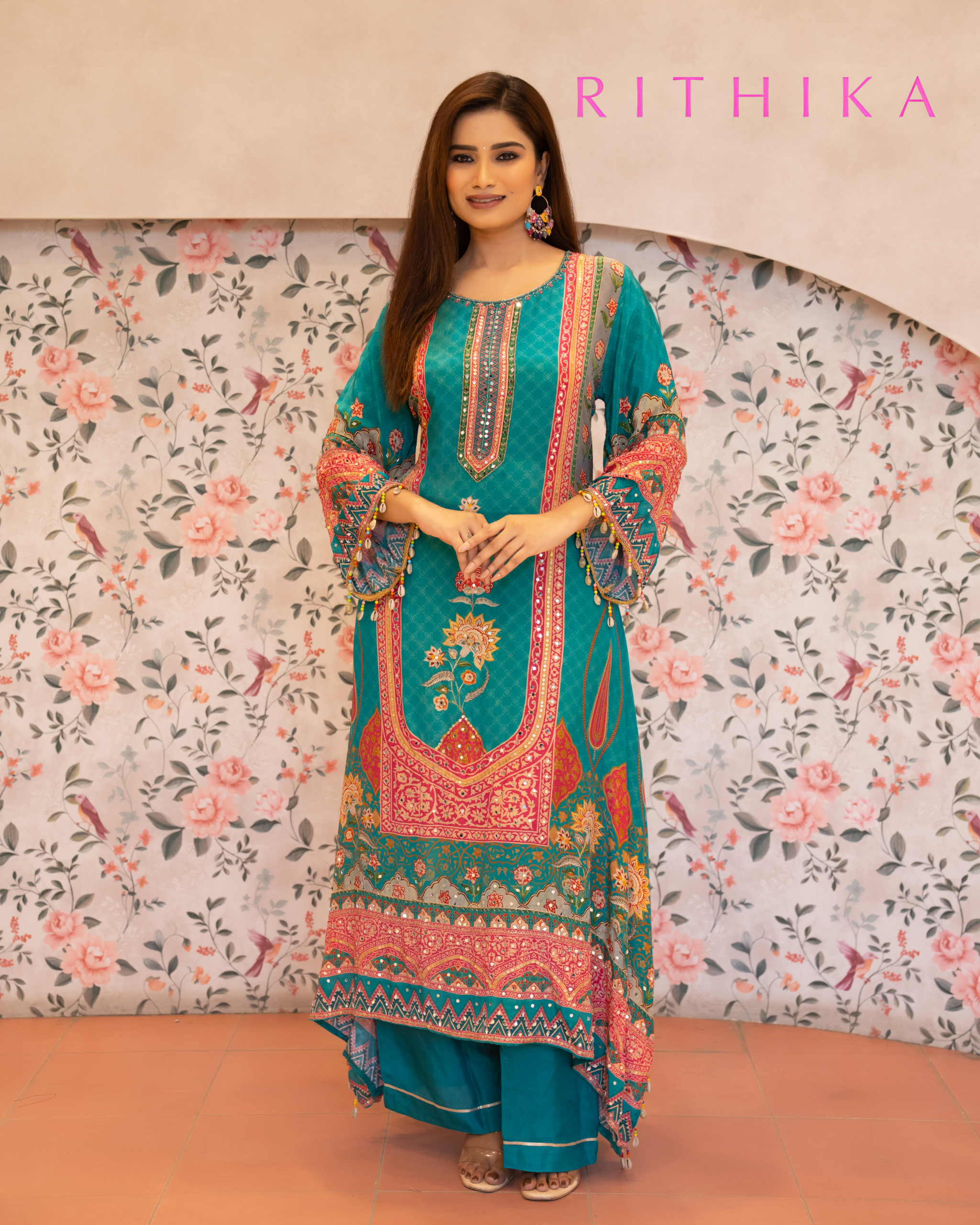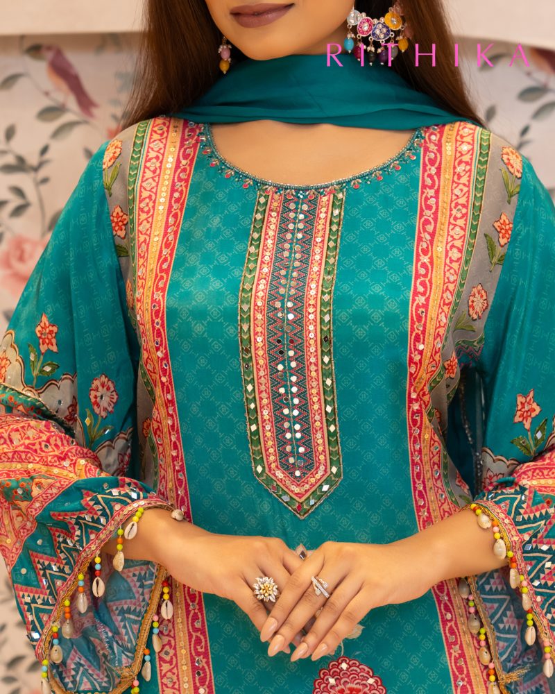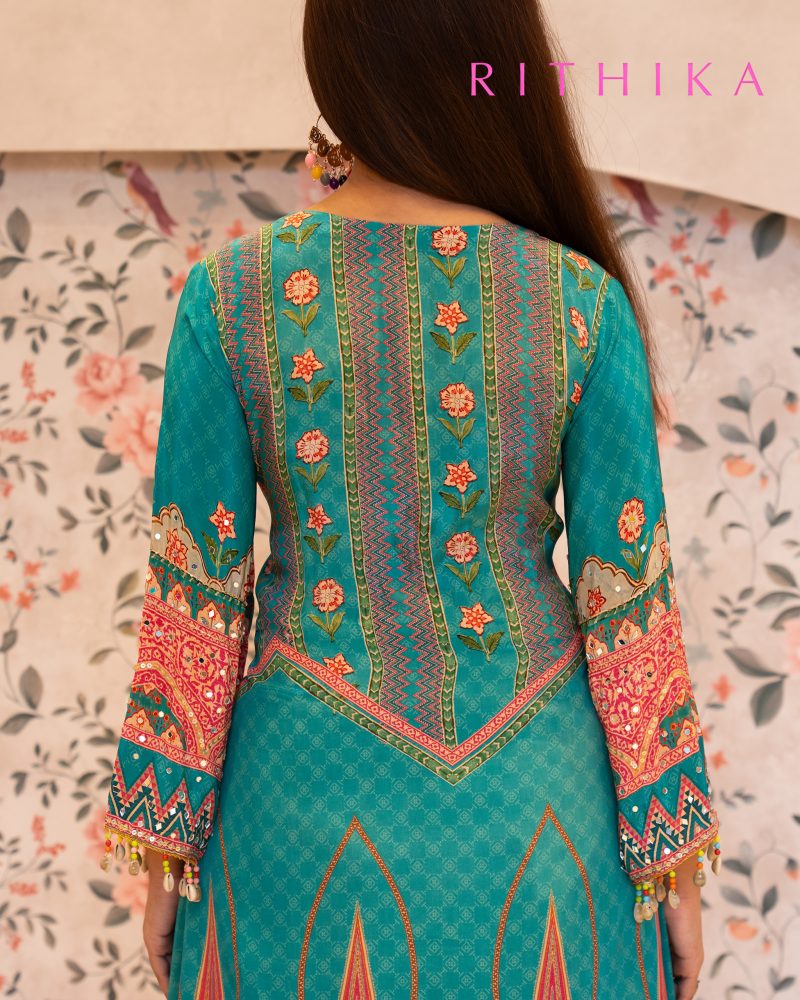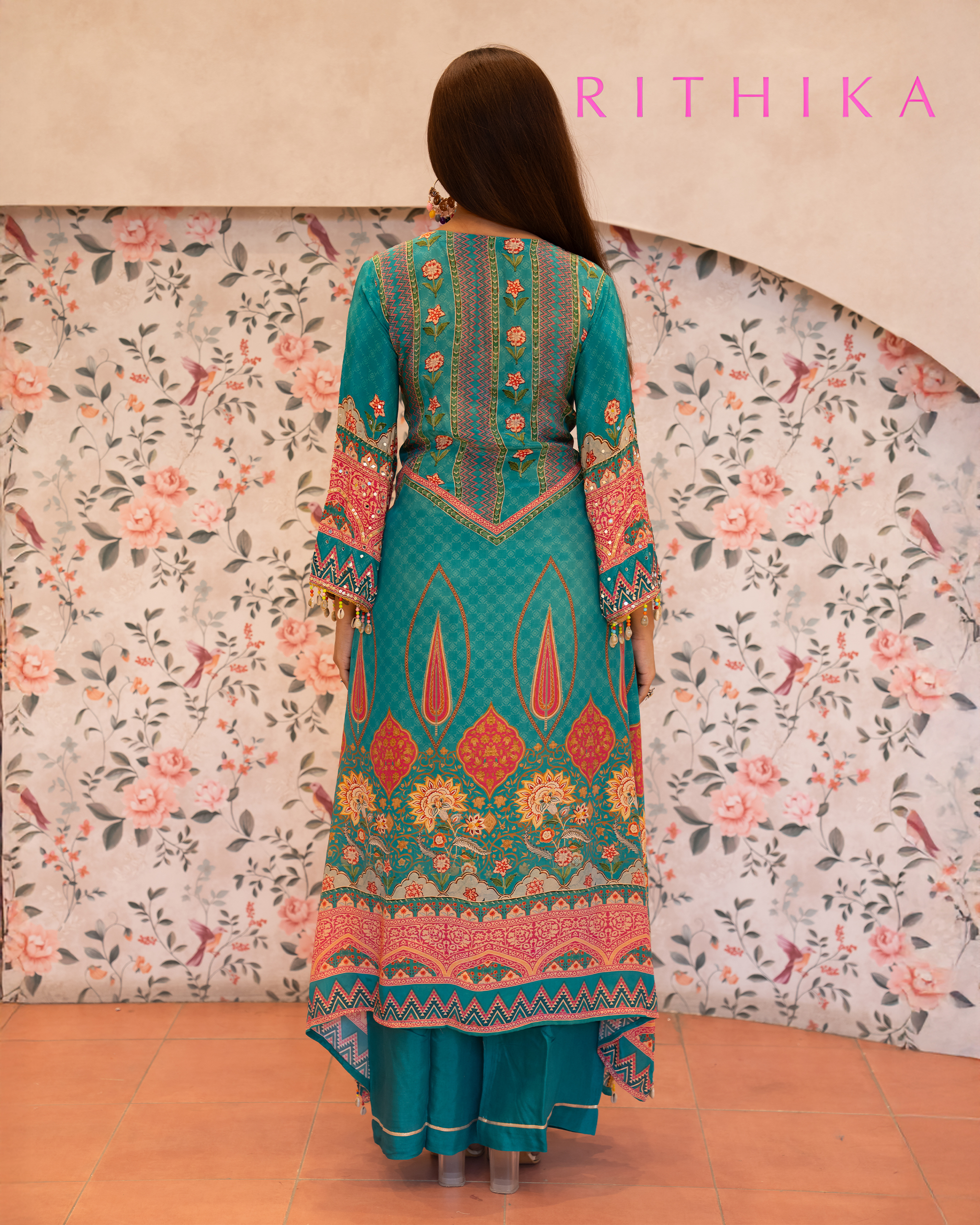 Green muslin silk Pakistani design fusion cut top with hand work and accessories with green palazzo pants and chiffon dupatta. Comes with 3/4th bell sleeves.