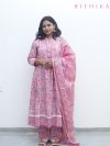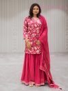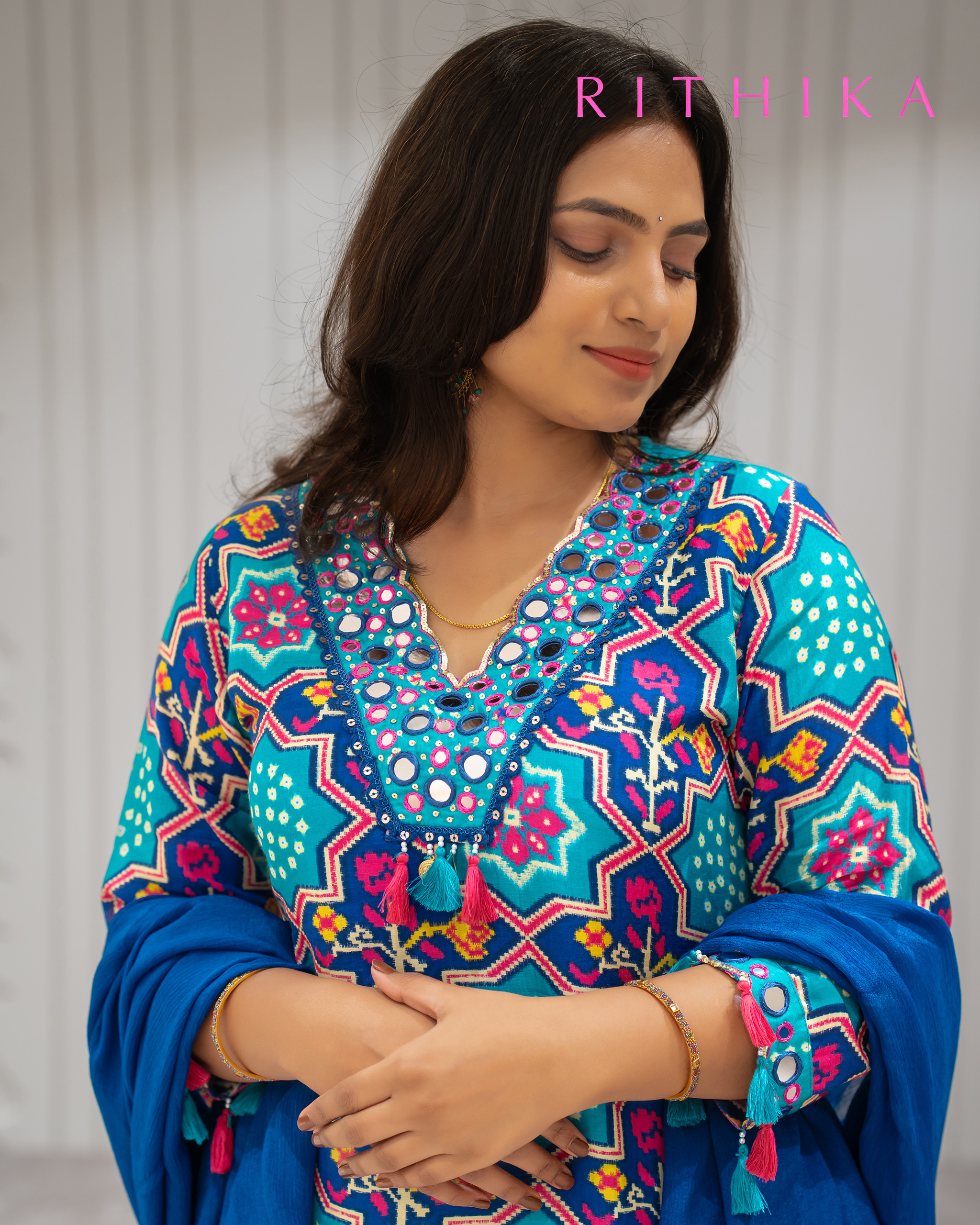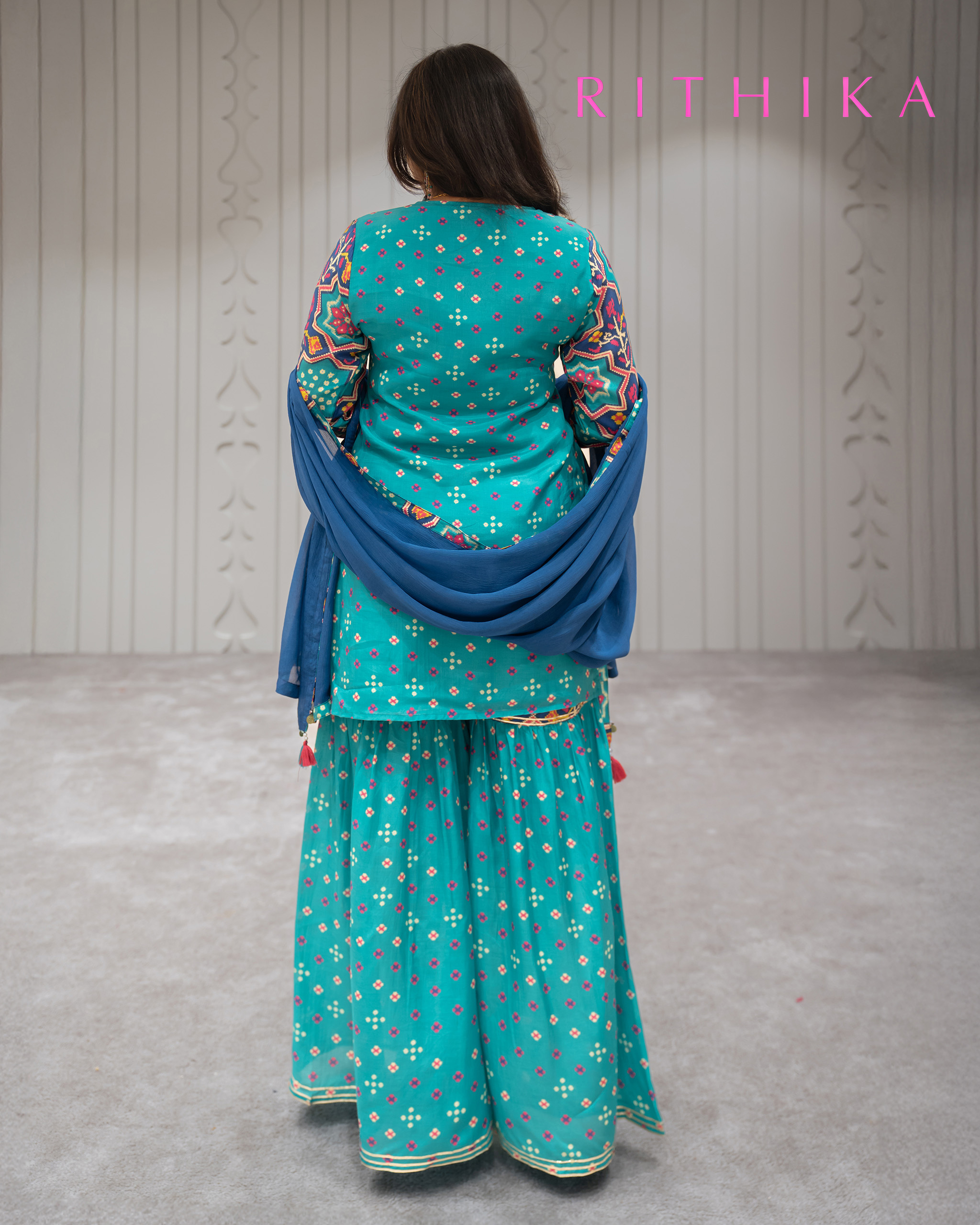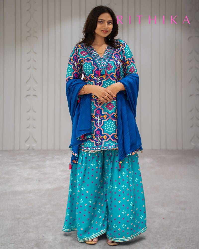 Green and blue silk fabric short kurta with all over ikkat print with mirror work on the neck green printed sharara bottom and silk dupatta. Comes with 3/4th sleeves.