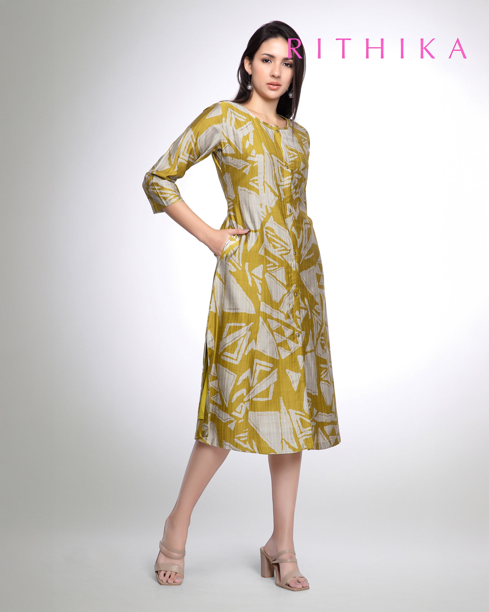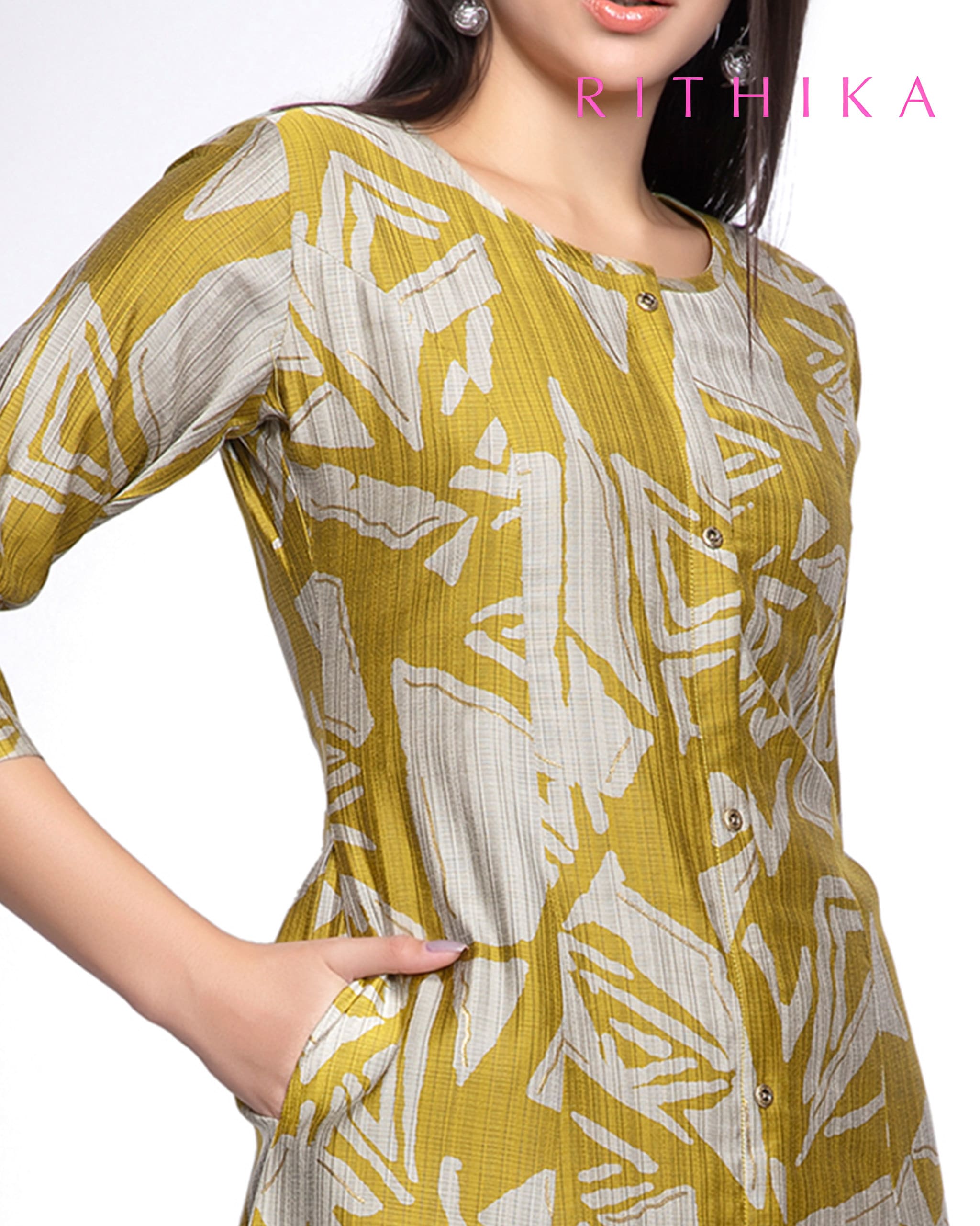 Greenish yellow silk fabric A line kurti with fancy buttons and 3/4th sleeves.