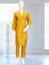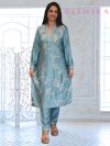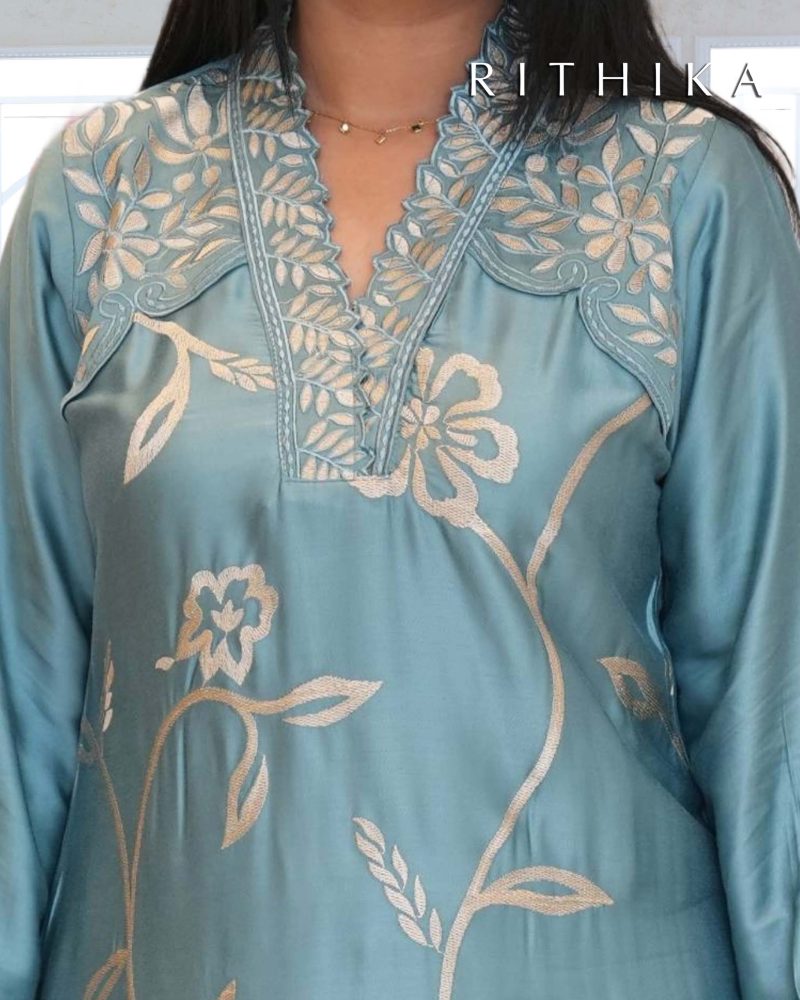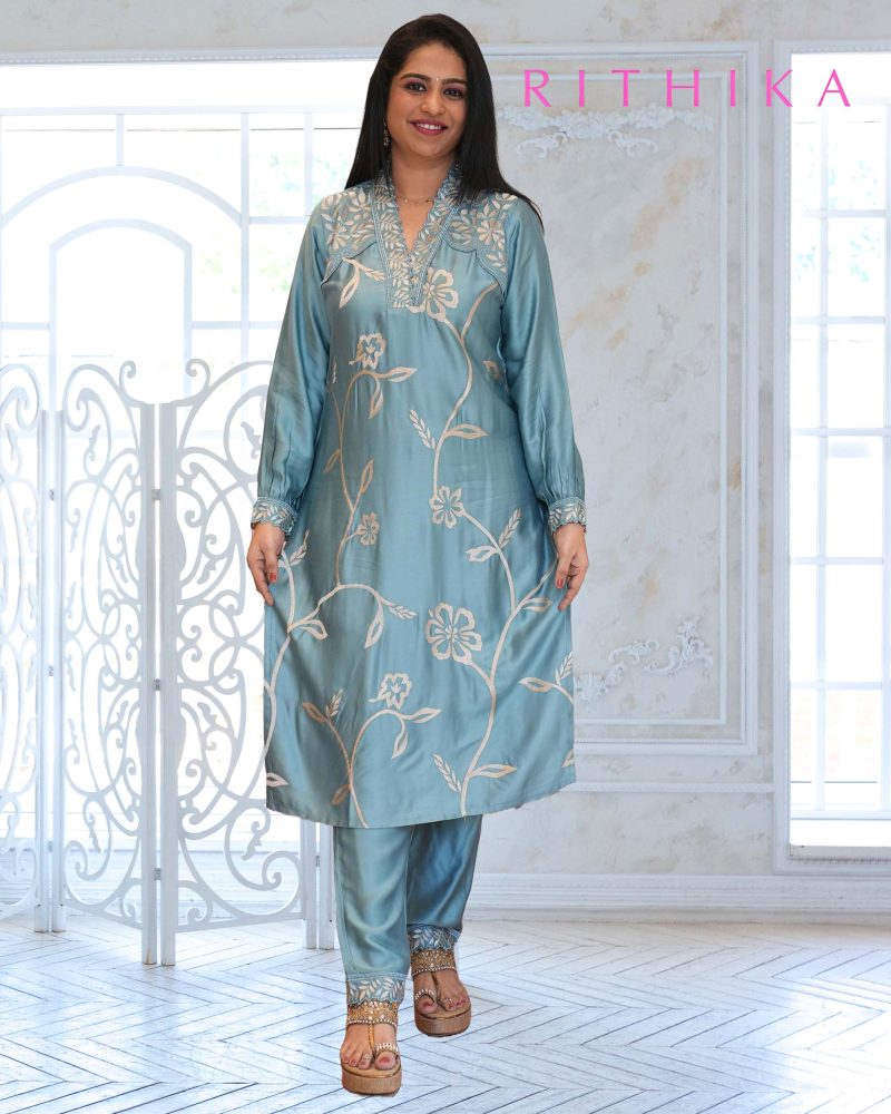 Greyish blue silk fabric co-ord set with all over thread embroidery with silk straight pants and 3/4th sleeves.