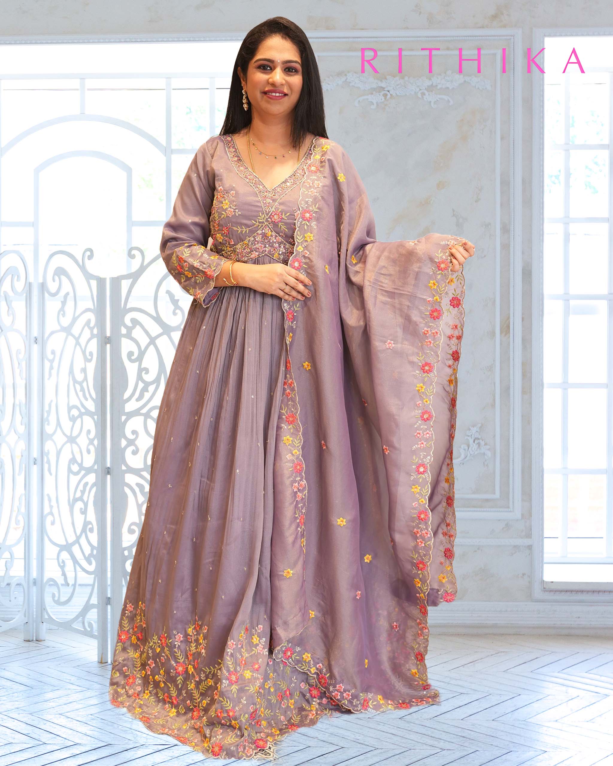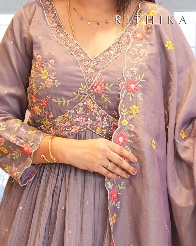 Light lavender tissue silk anarkali suit with all over multicolored thread embroidery with hand work on the neck, with a tissue silk embroided dupatta. Comes with 3/4th sleeves.