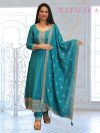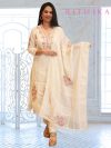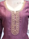Light lavender tissue silk anarkali suit with all over multicolored thread embroidery with hand work on the neck, with a tissue silk embroided dupatta. Comes with 3/4th sleeves.
