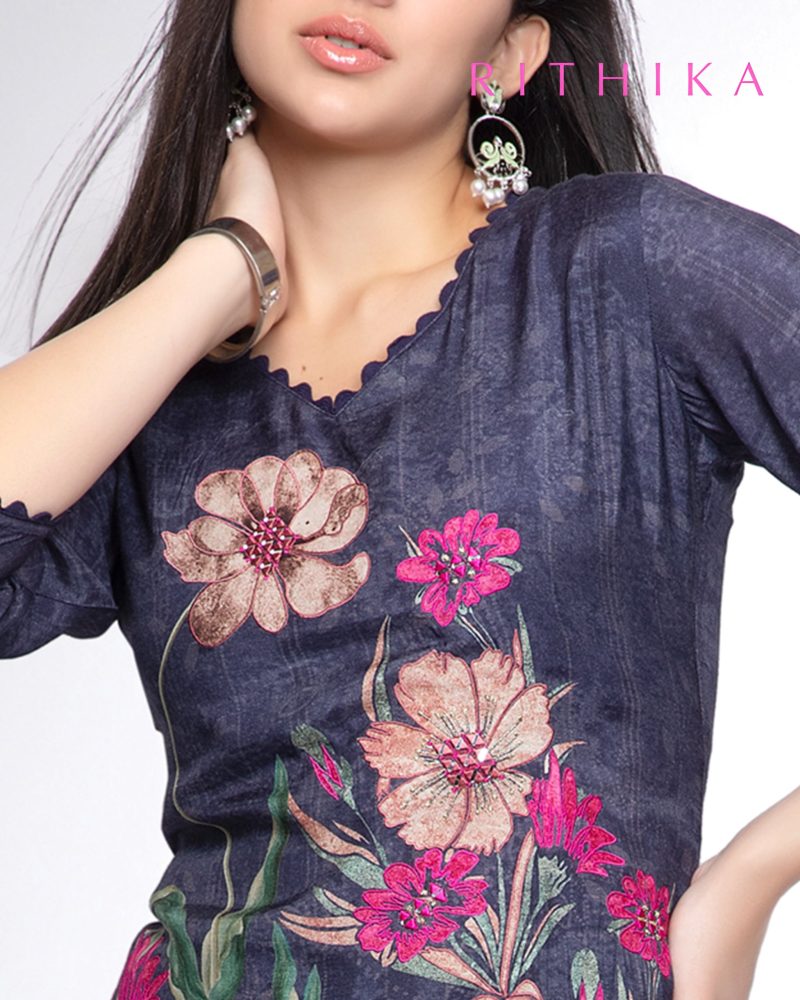 Light lavender muslin silk straight cut kurti with floral print high lighted with thread and mirror work, with 3/4th sleeves.