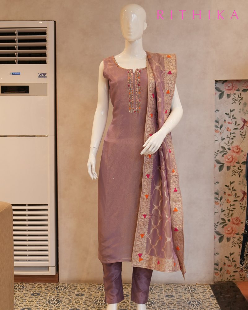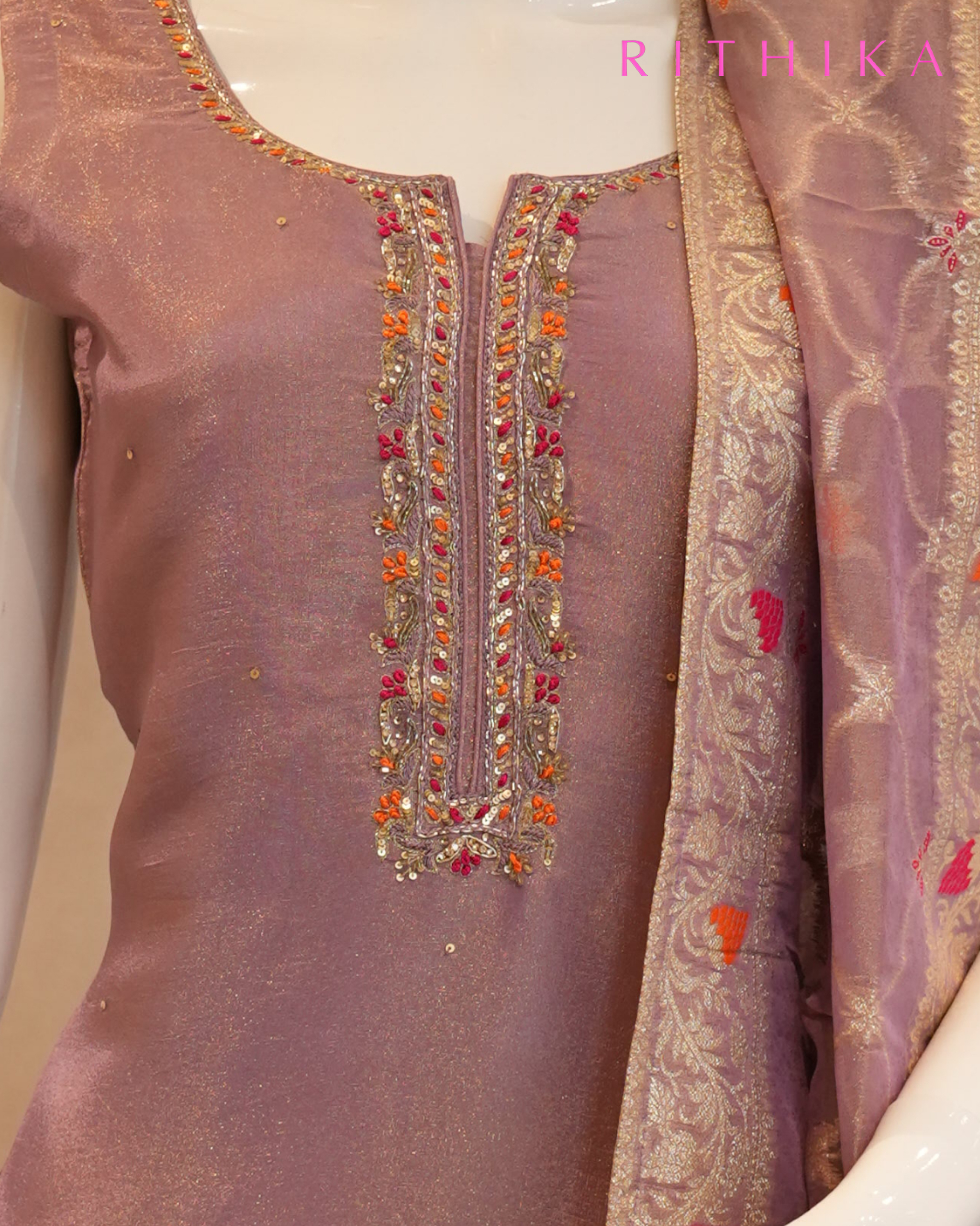 Mauve soft silk straight cut with hand work on the neck, silk straight pants with a contrast printed organza dupatta with zari work. Comes with 3/4th sleeves.