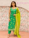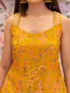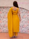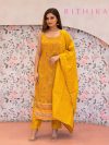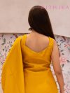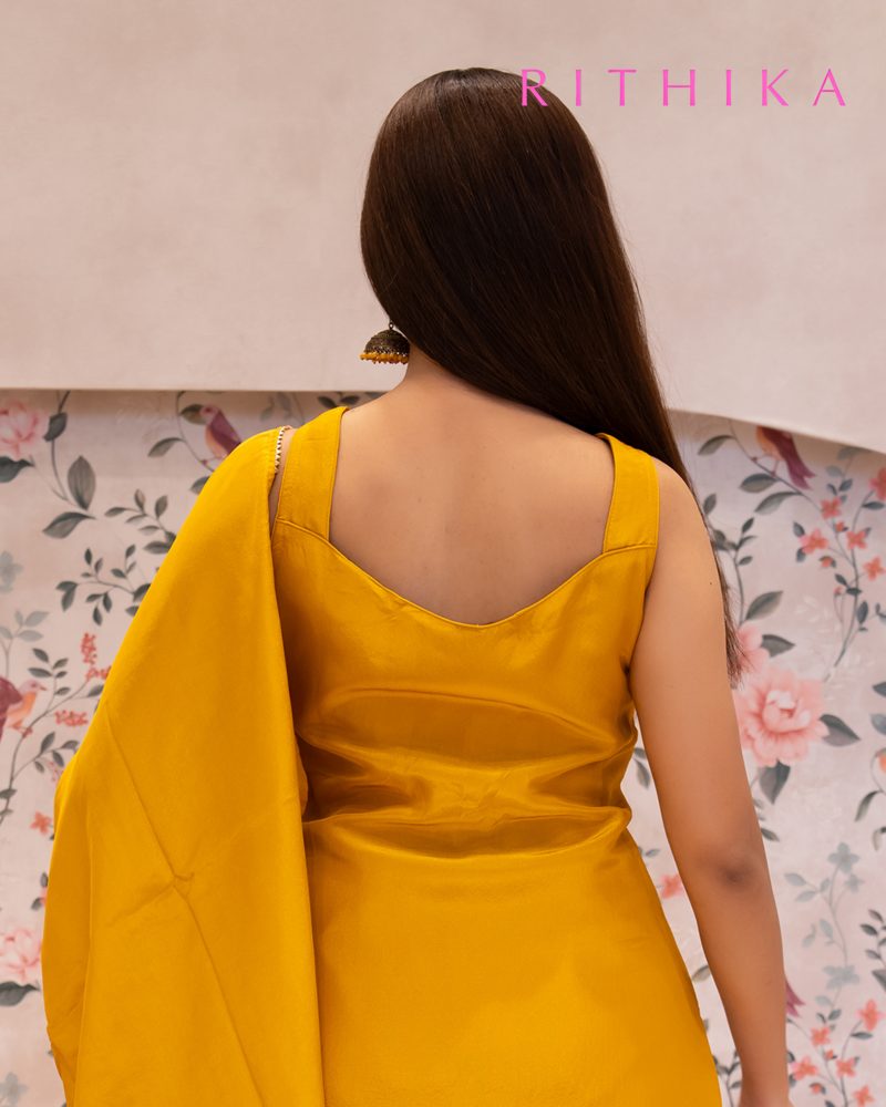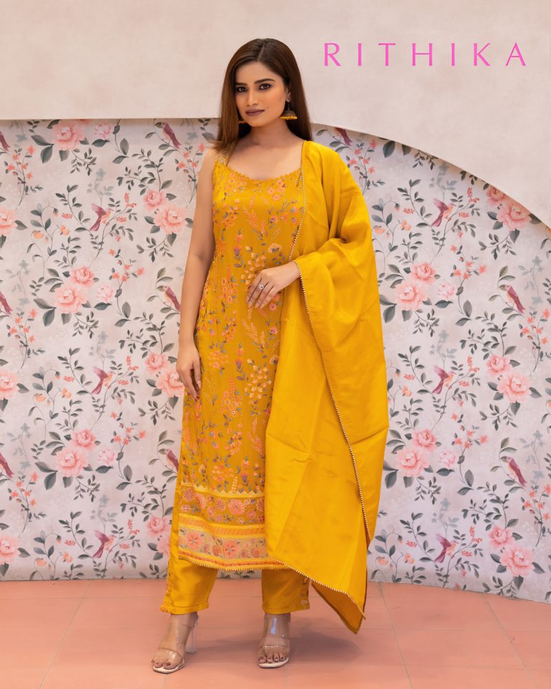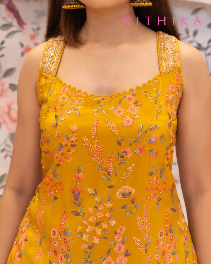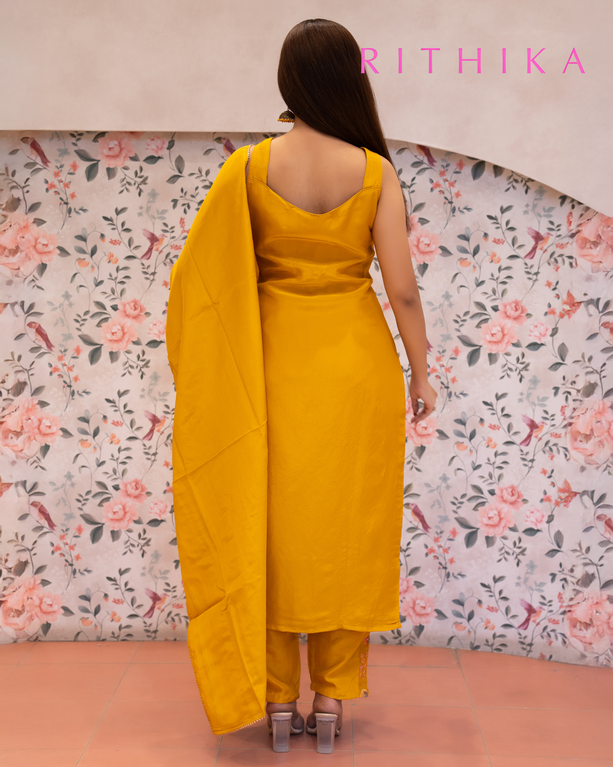 Mustard tissue silk straight cut with all over thread embroidery, mustard silk straight pants with silk dupatta and 3/4th sleeves.