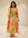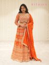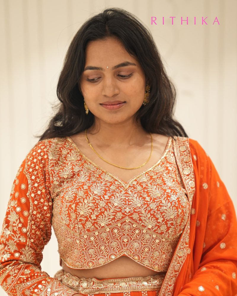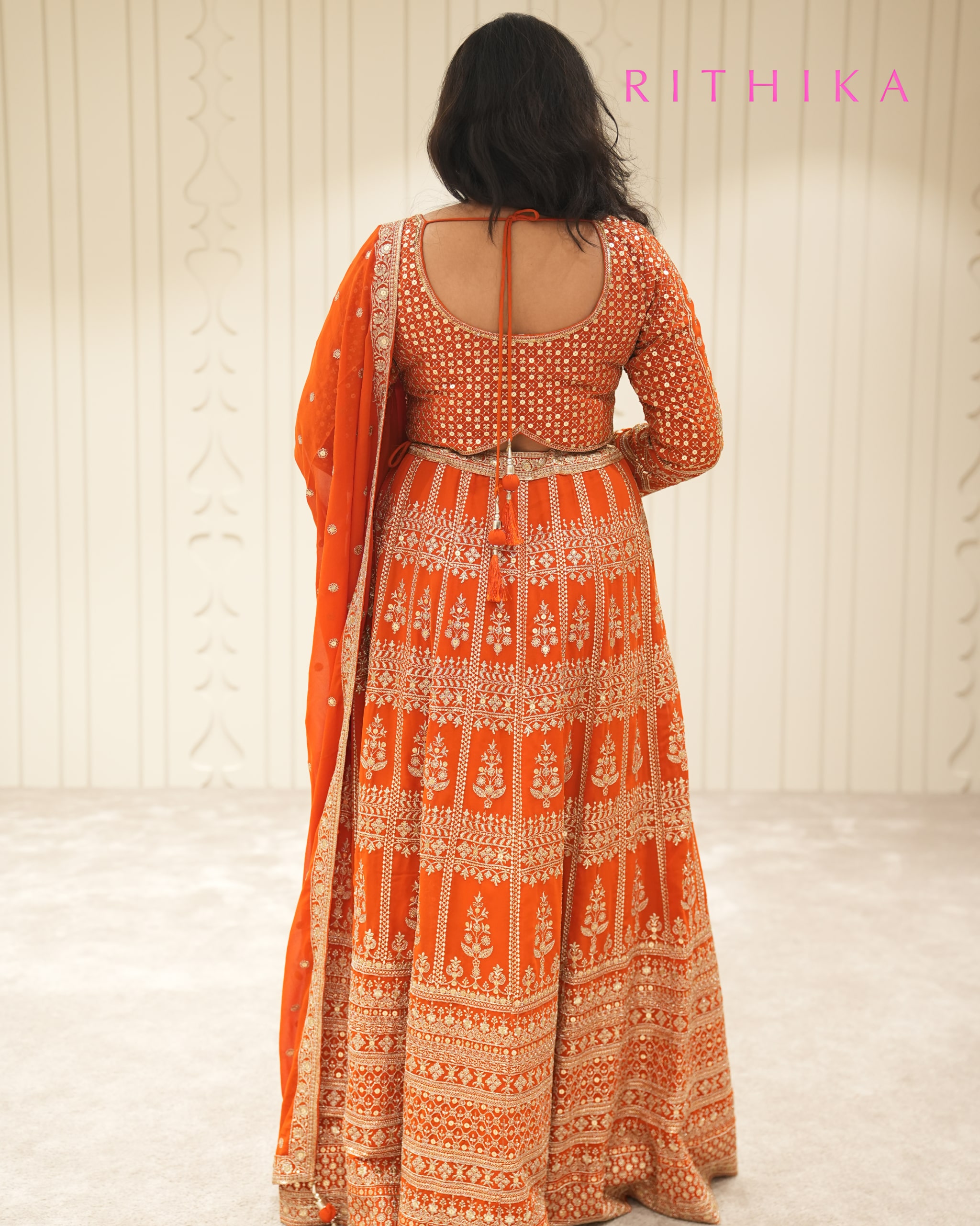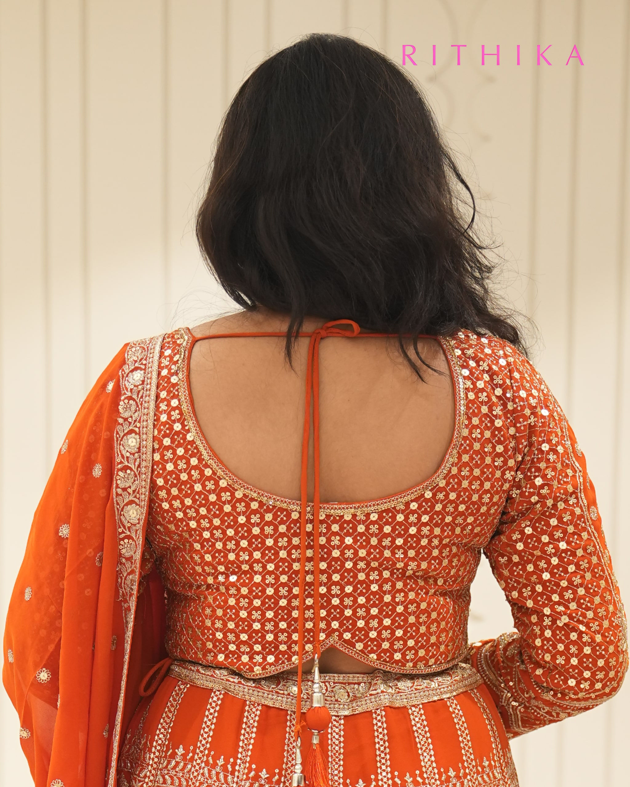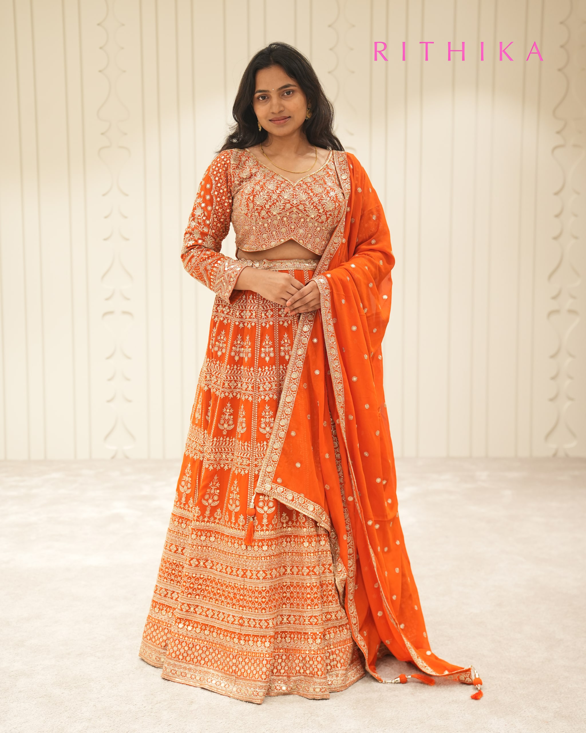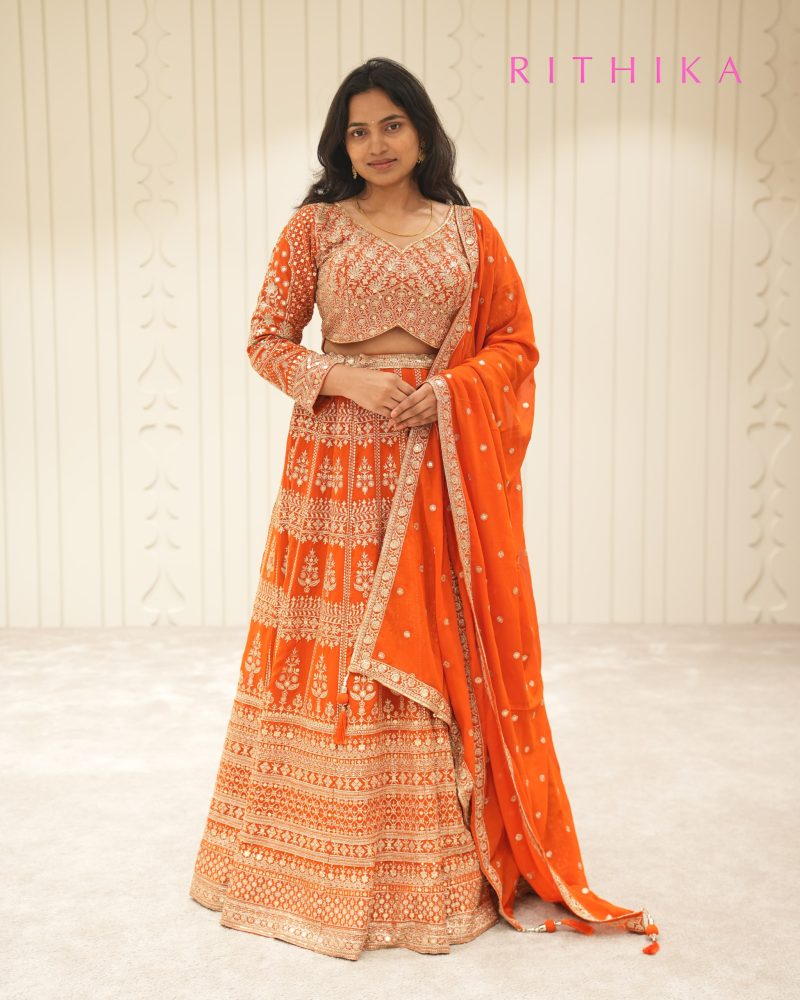 Orange georgette fabric lehenga with all over zari embroidery with a heavily embroided crop top with 3/4th sleeves and heavy dupatta.