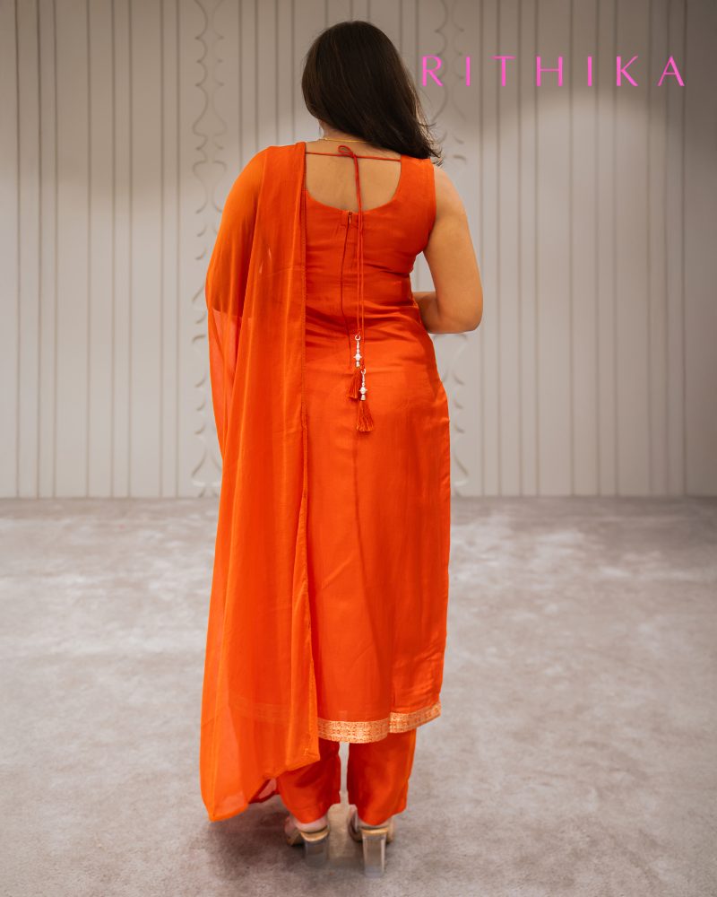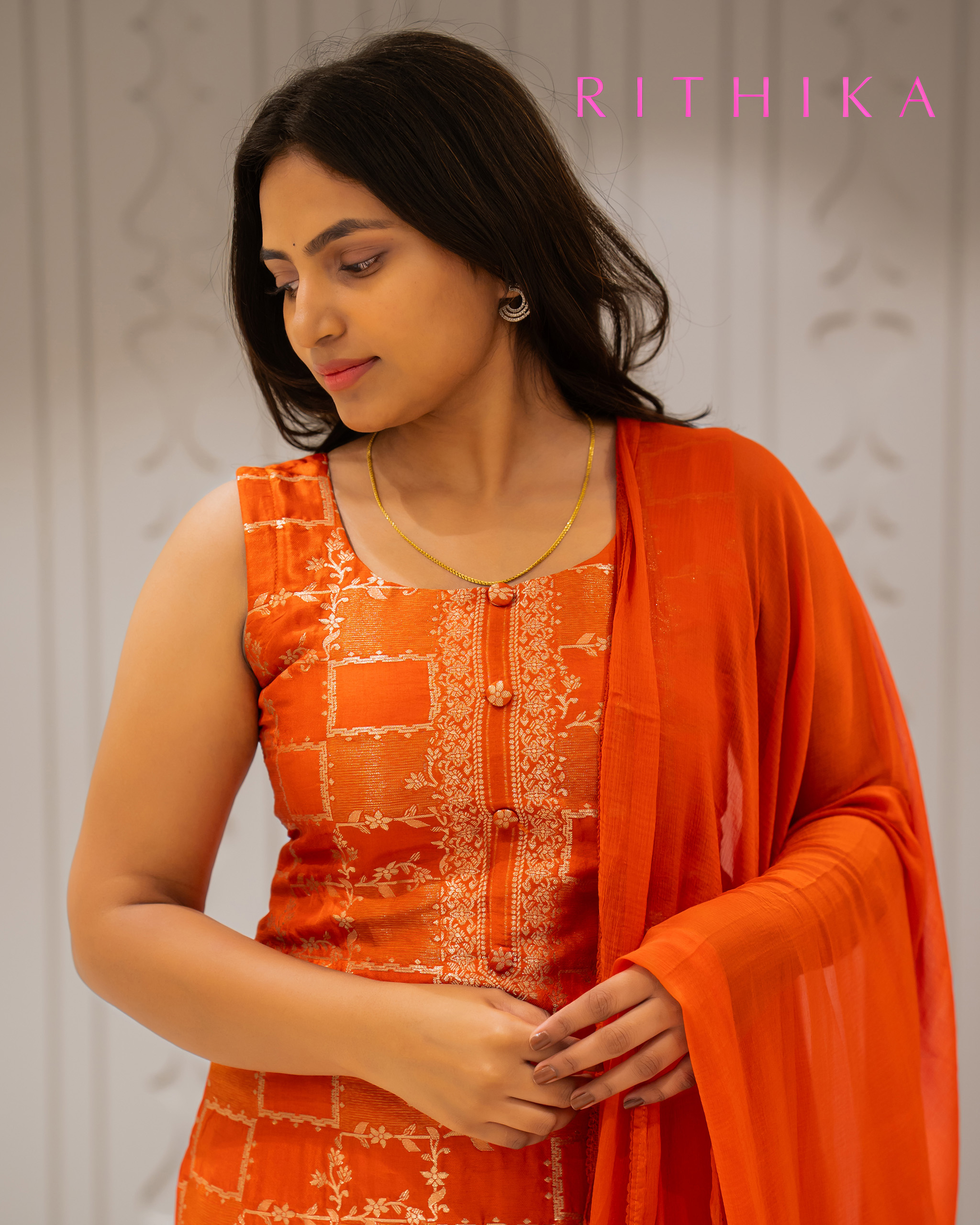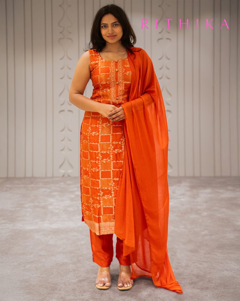 Orange soft silk straight cut with all over brocade weaving, silk straight pants with a chiffon dupatta. Comes with 3/4th sleeves.