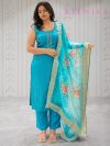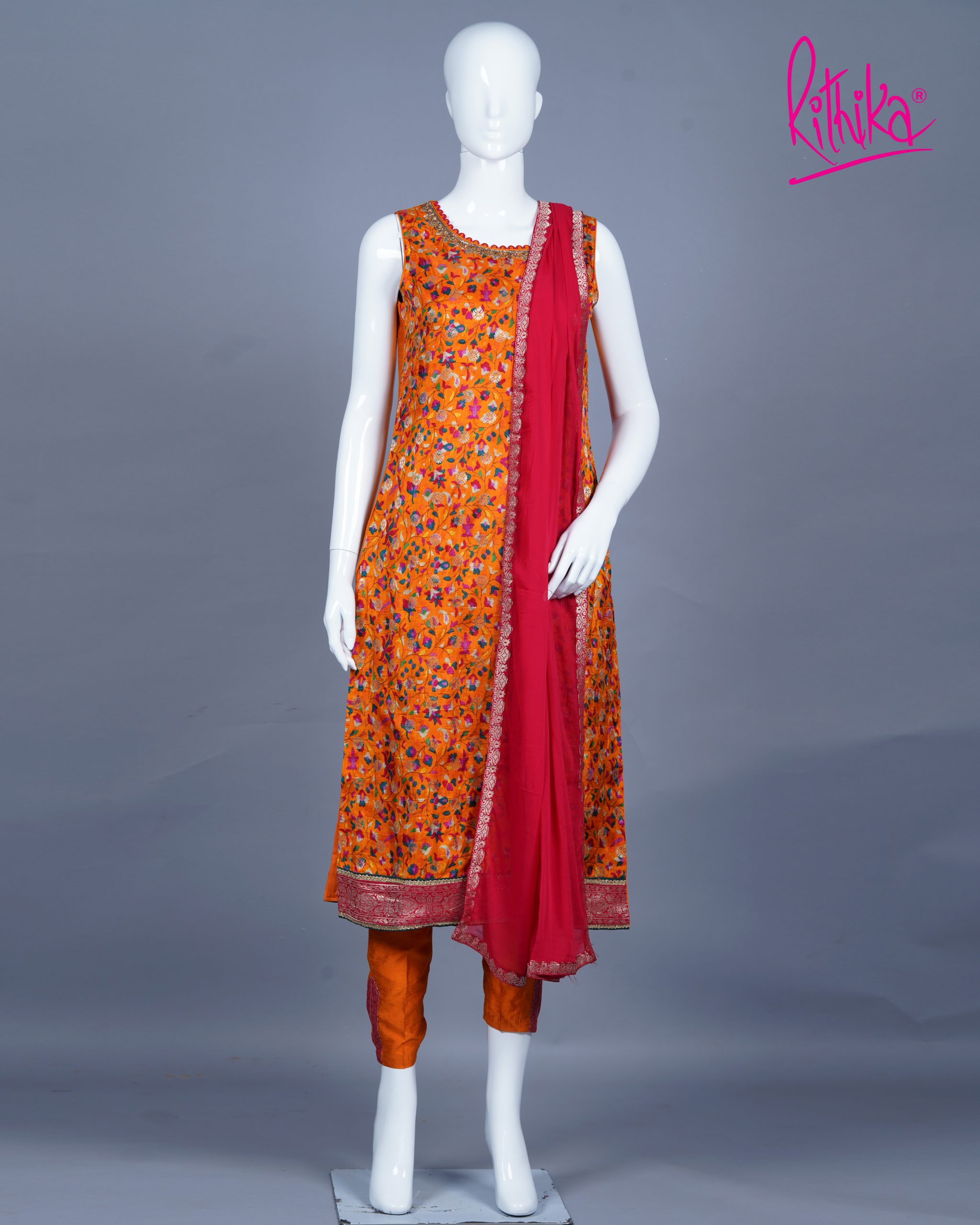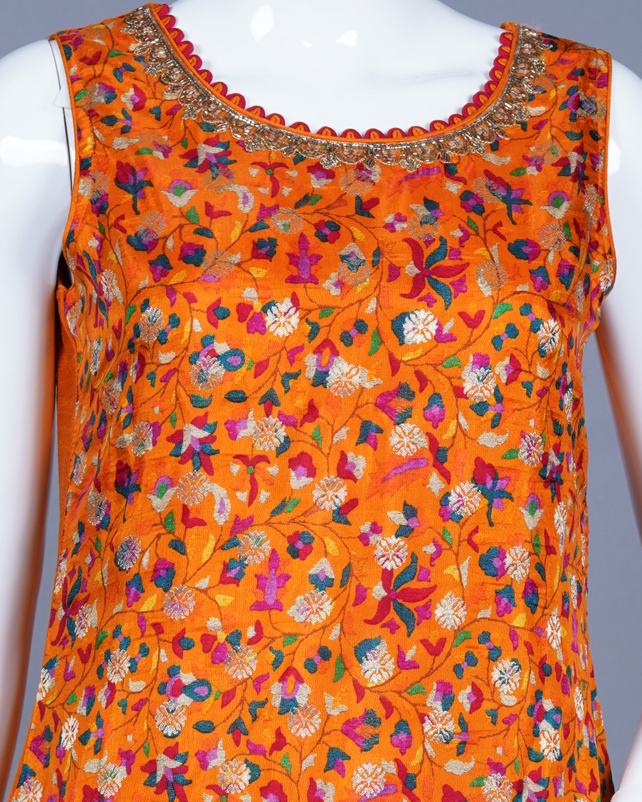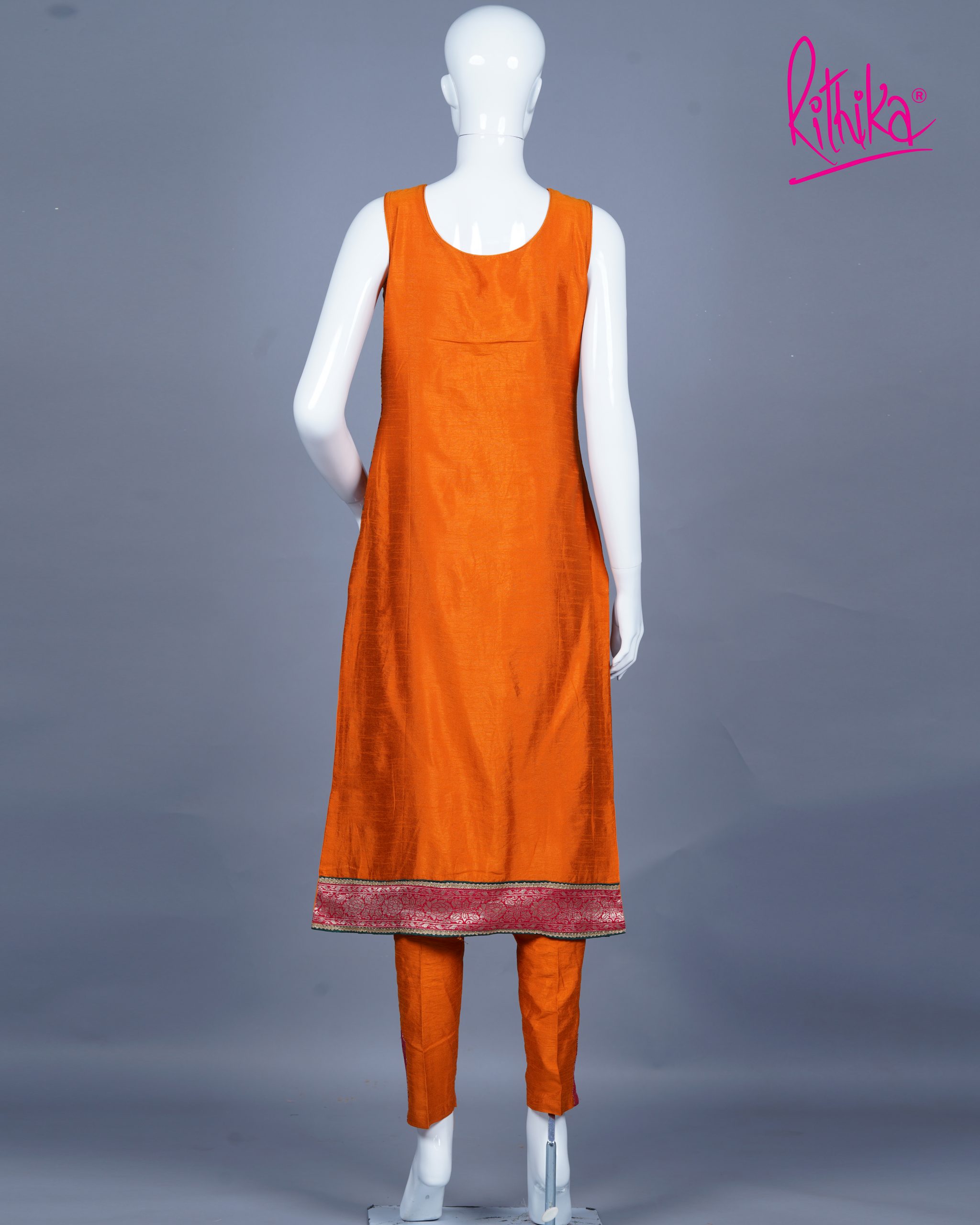 Orange soft silk straight cut with all over brocade weaving, silk straight pants with a chiffon dupatta. Comes with 3/4th sleeves.
