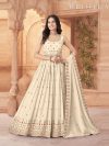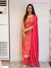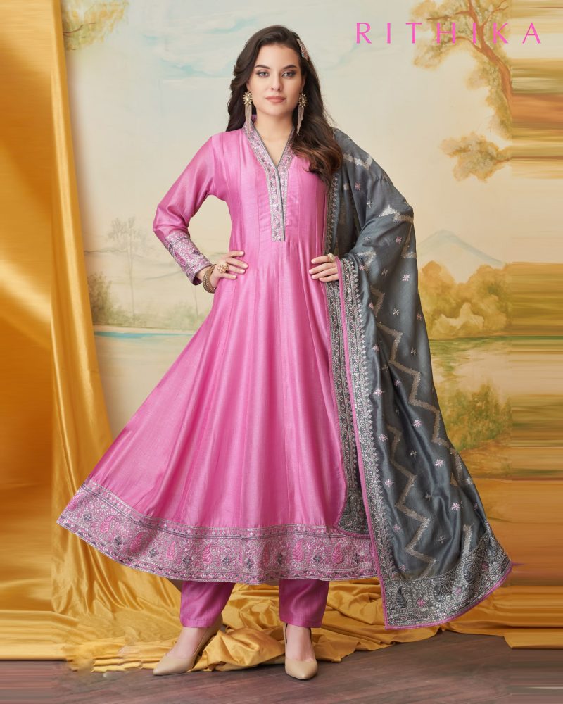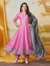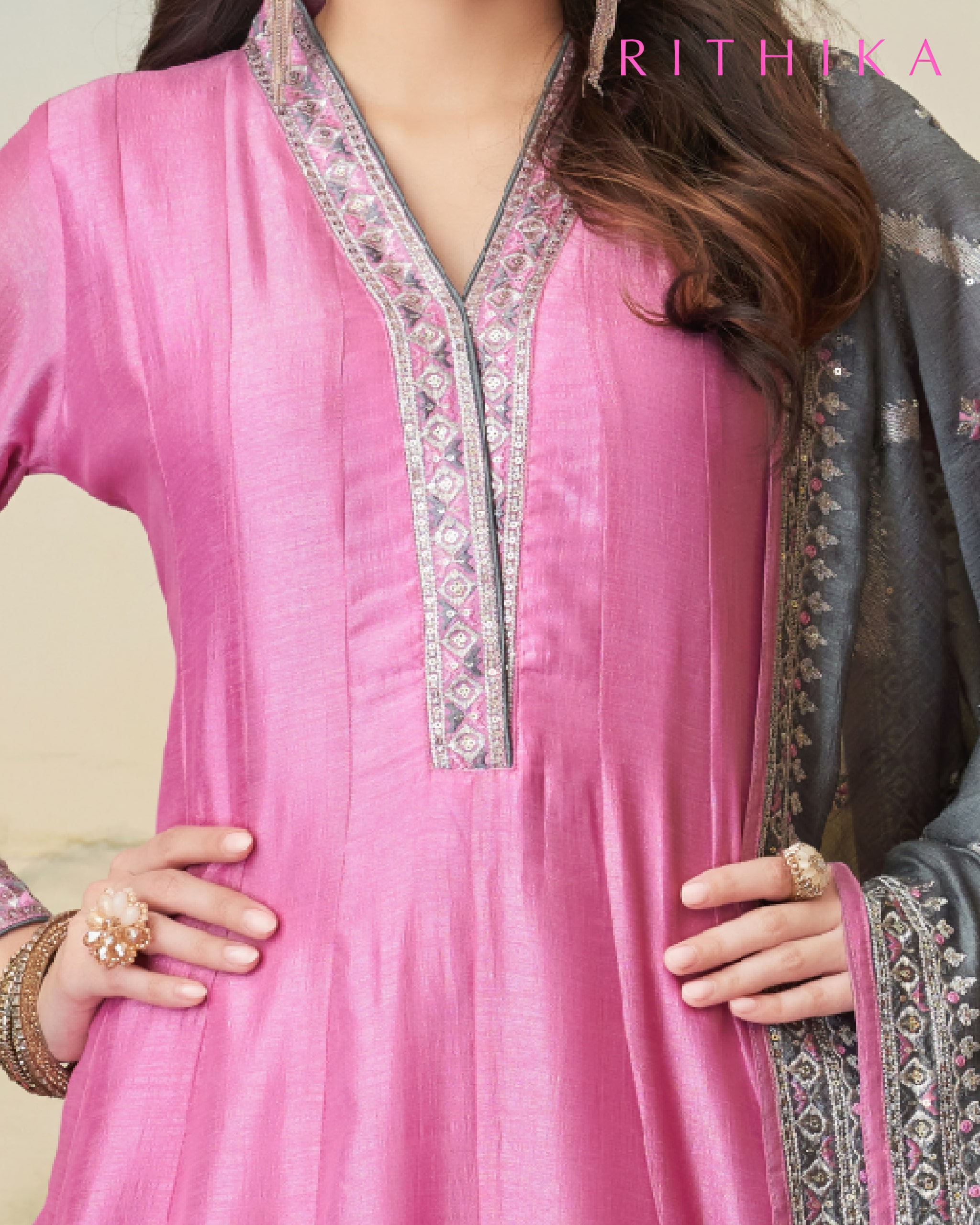 Pink silk fabric anarkali with thread and zari border on the neck and daman, silk straight pants with a contrast grey silk dupatta with heavy embroidery. Comes with 3/4th sleeves.