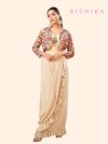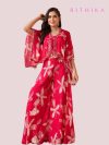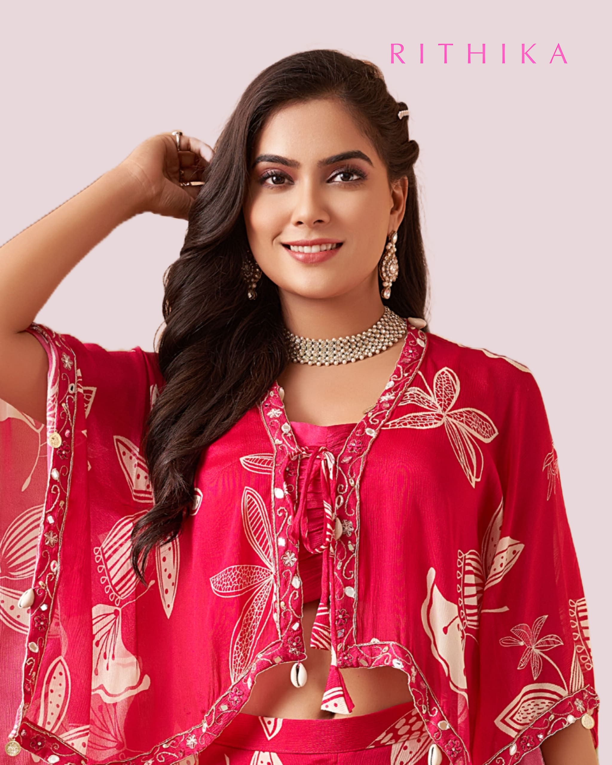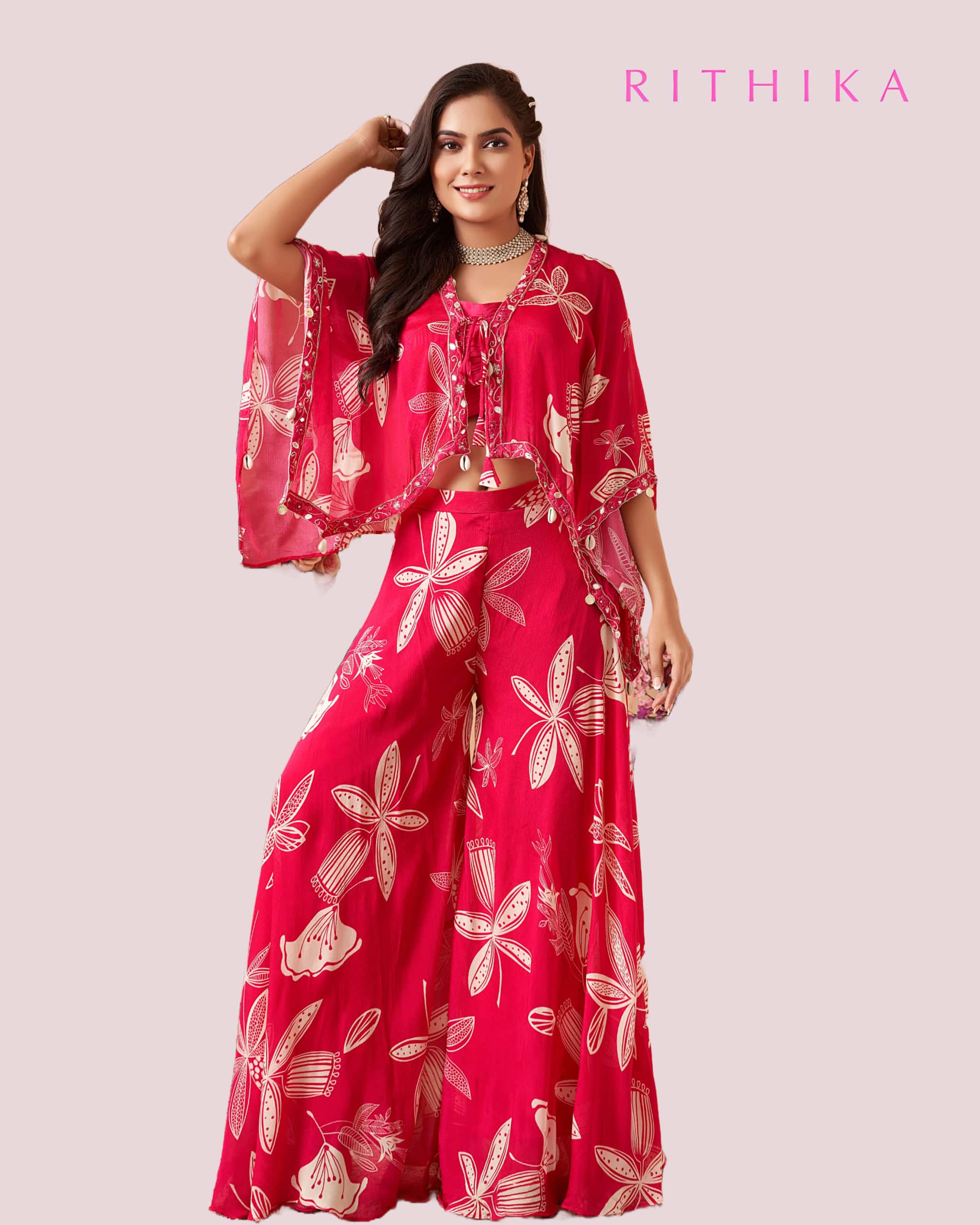 Pink silk fabric indo western outfit with printed palazzo pants, crop top with a short separate cape.