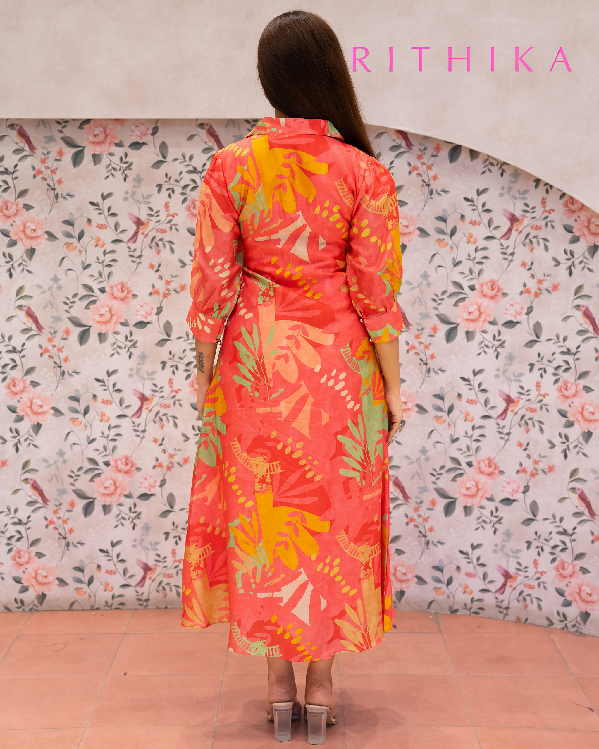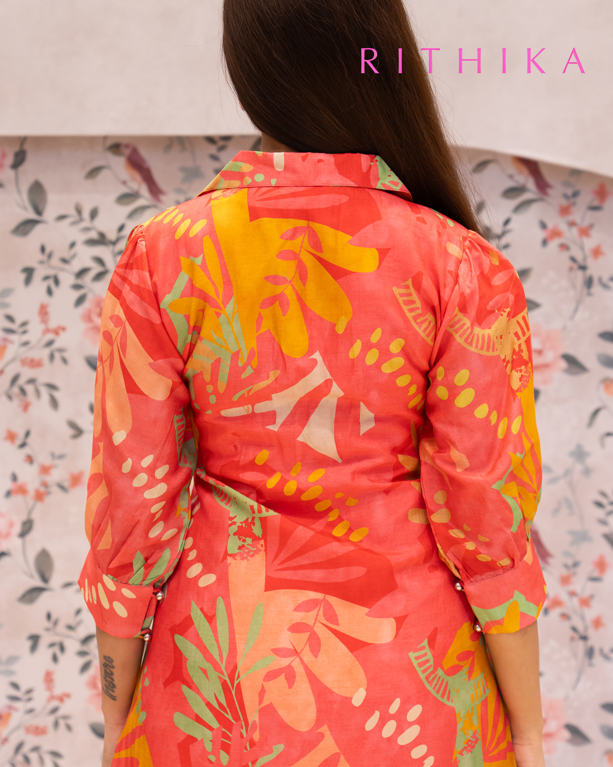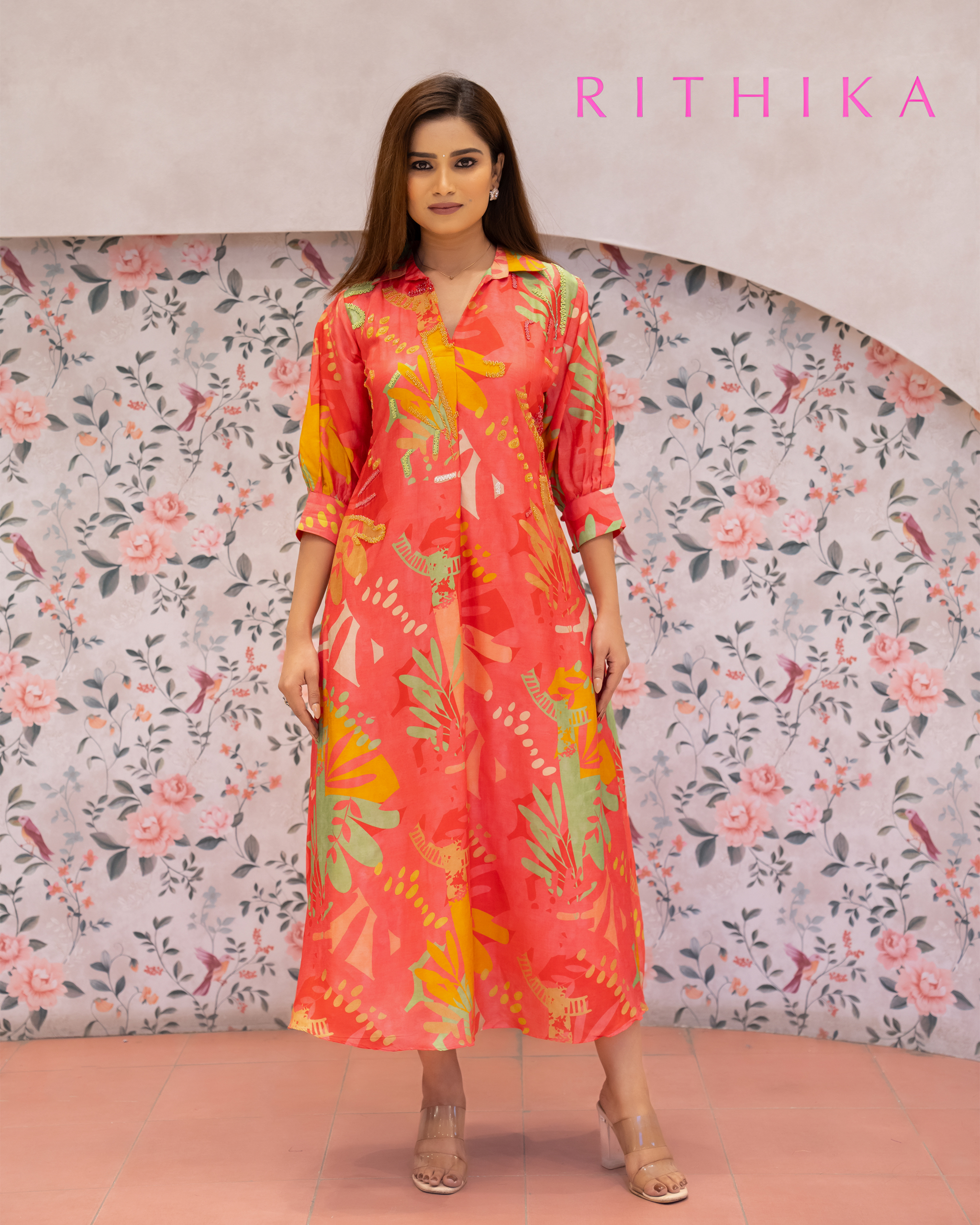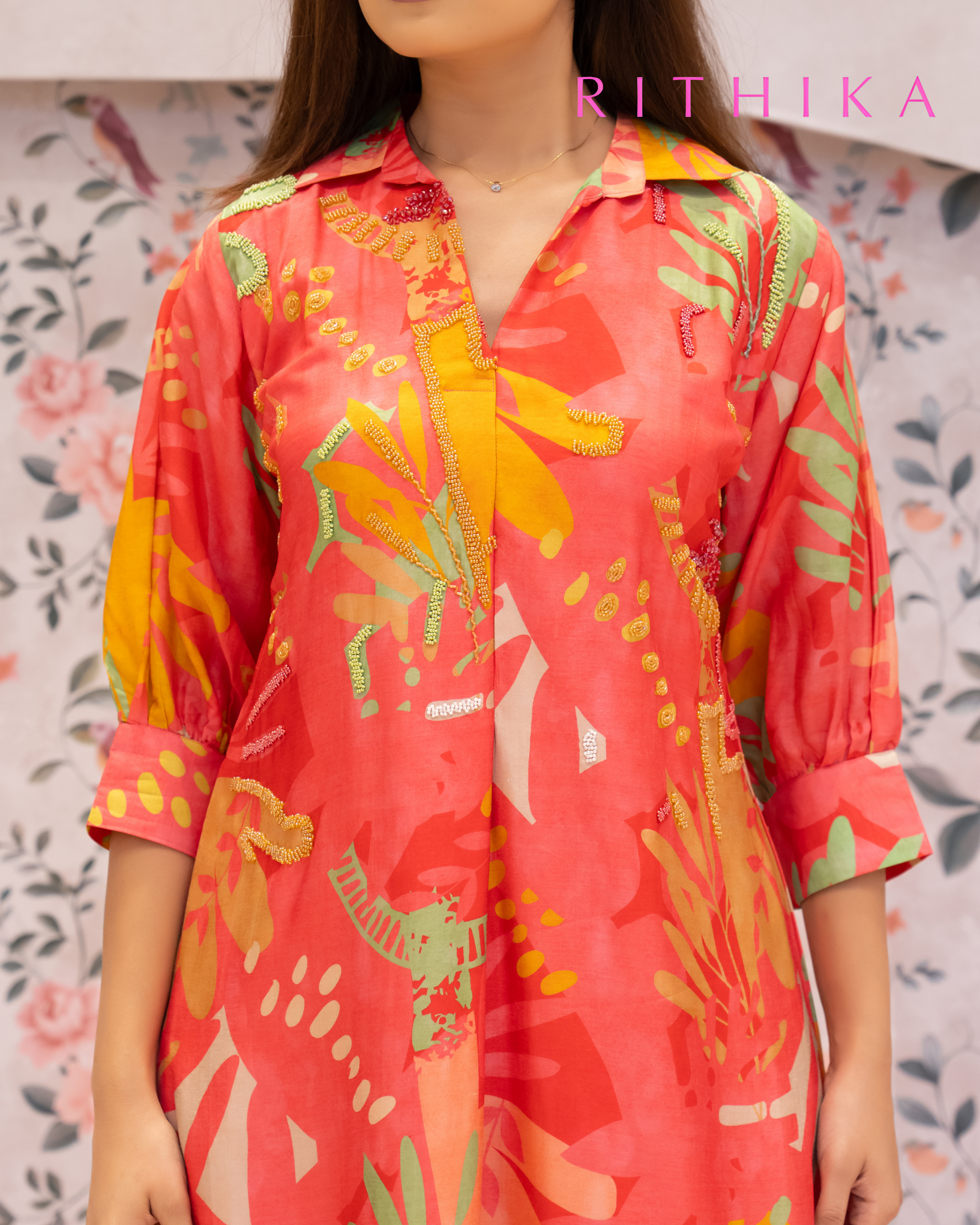 Pink muslin silk kurti with all over floral print with bead work collar neck and 3/4th sleeves.