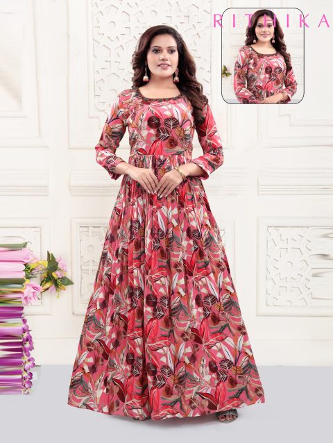 Pink n green linen fabric straight cut kurti with all over print and thread embroidery, comes with 3/4th sleeves.