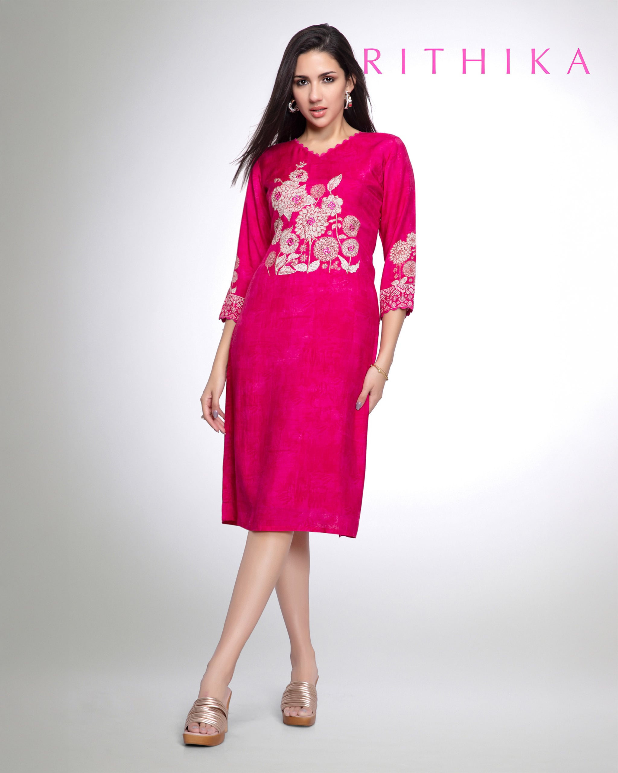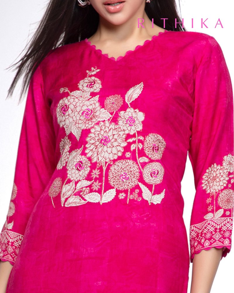 Pink muslin silk straight cut kurti with cream floral print high lighted with thread and zari work, with 3/4th printed sleeves.