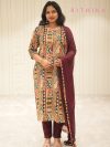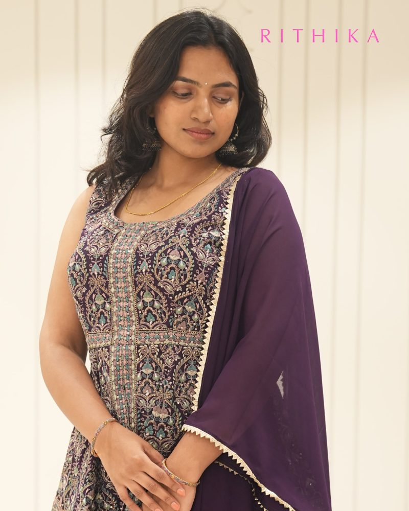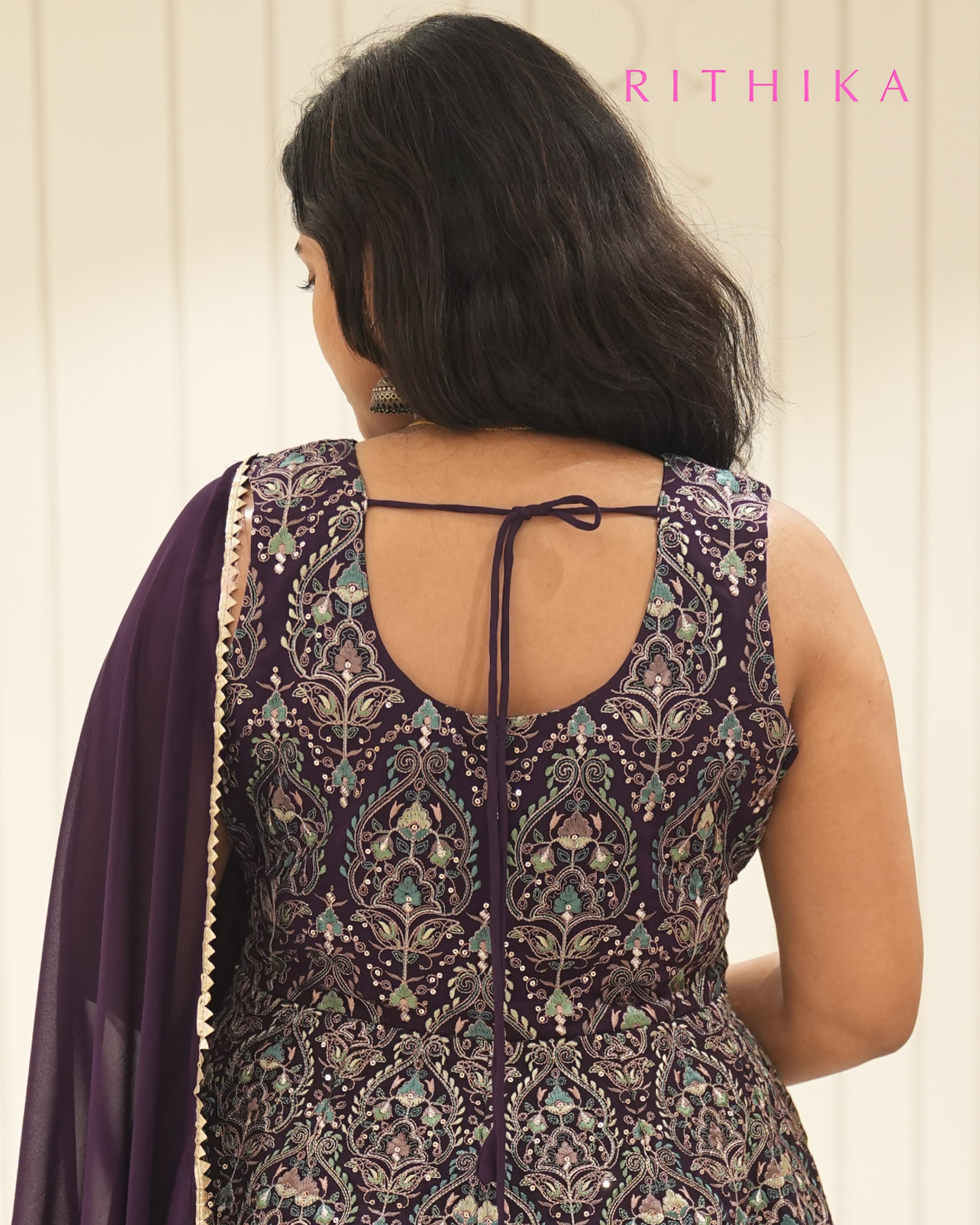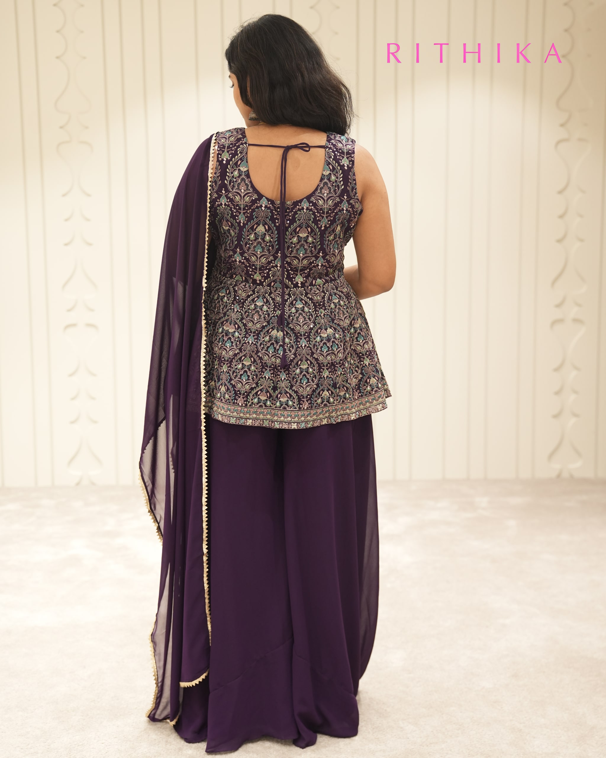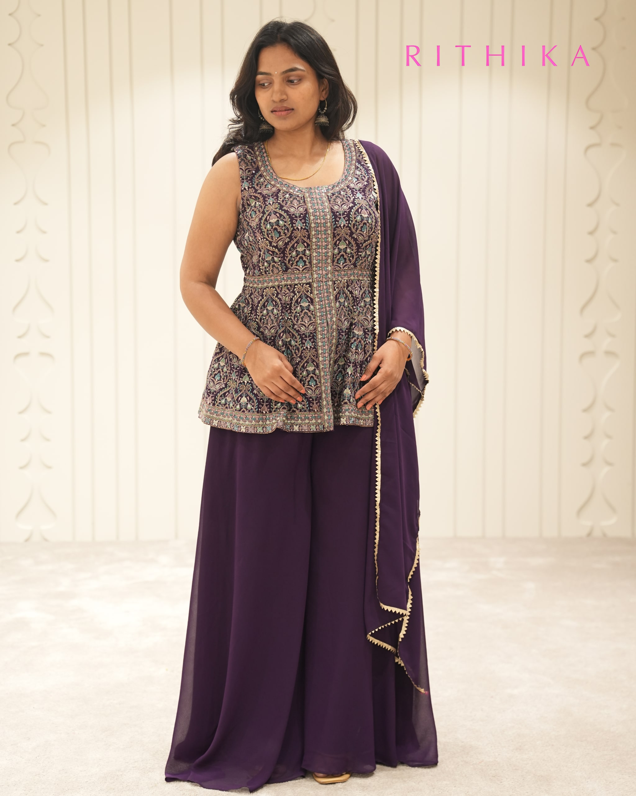 Purple color georgette fabric peplum top with all over heavy thread embroidery, with a georgette palazzo pants with a georgette dupatta. comes with 3/4th sleeves.