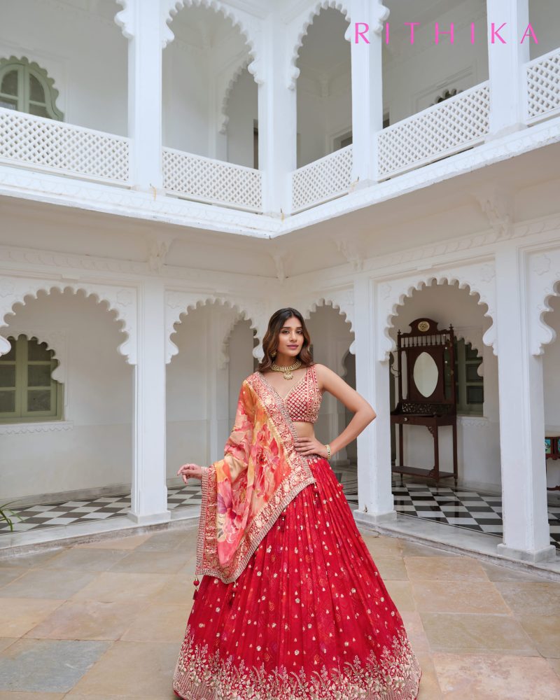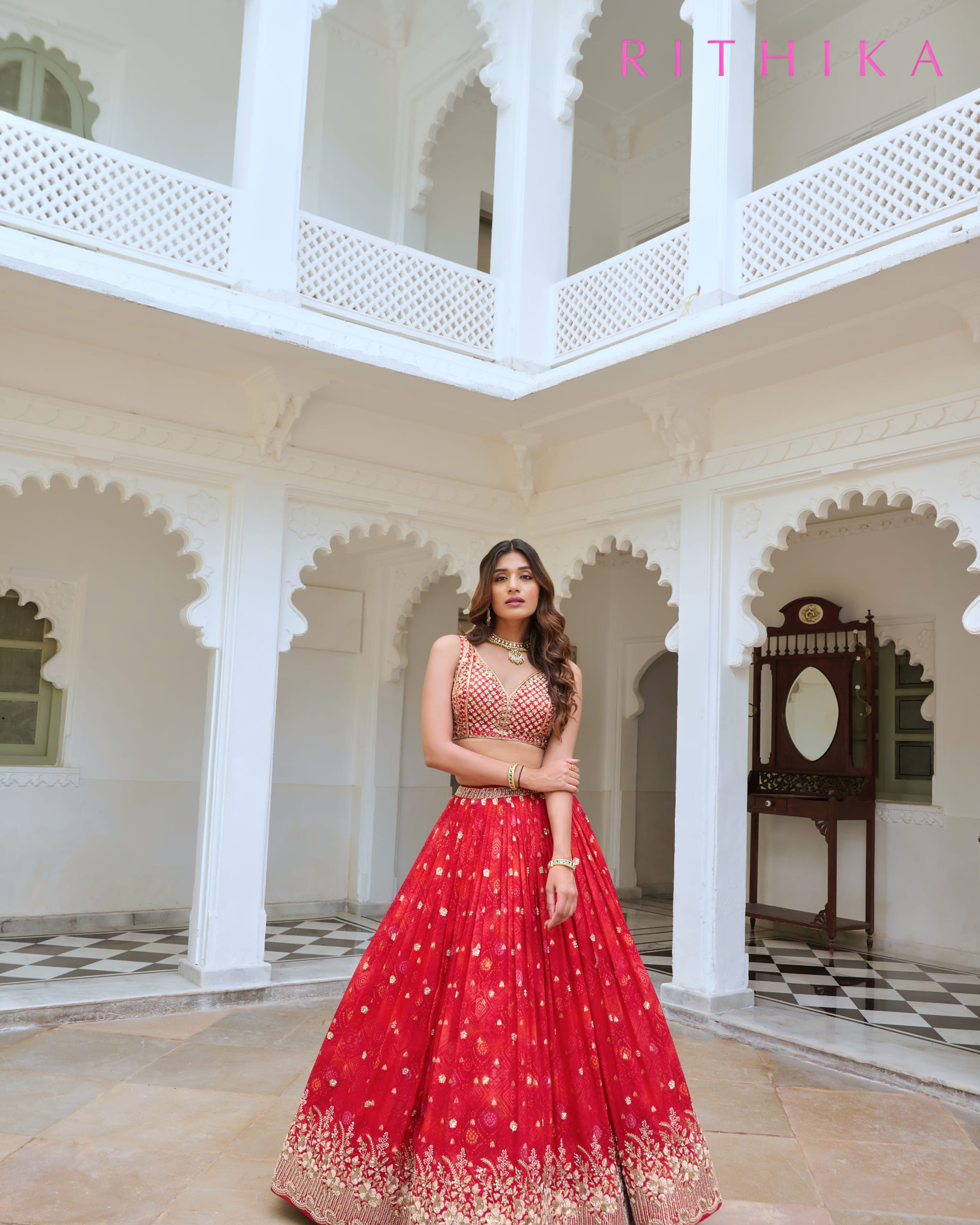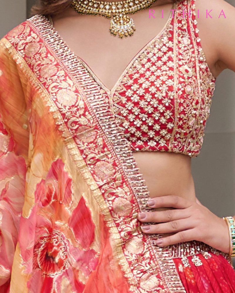 Red net fabric lehenga with all over zari and cut dana work with a heavy embroided choli and net dupatta. Comes with full sleeves.