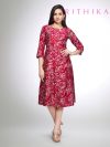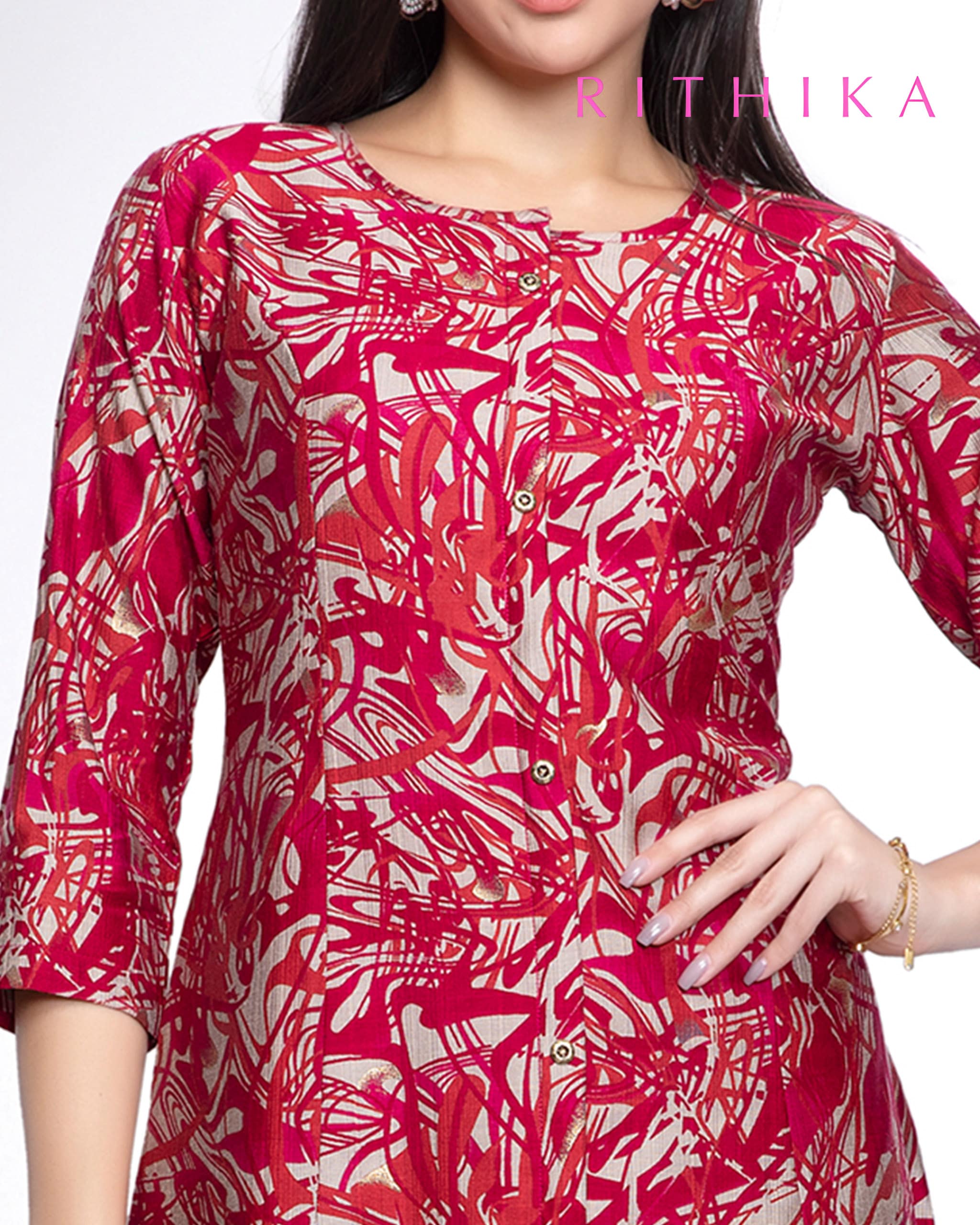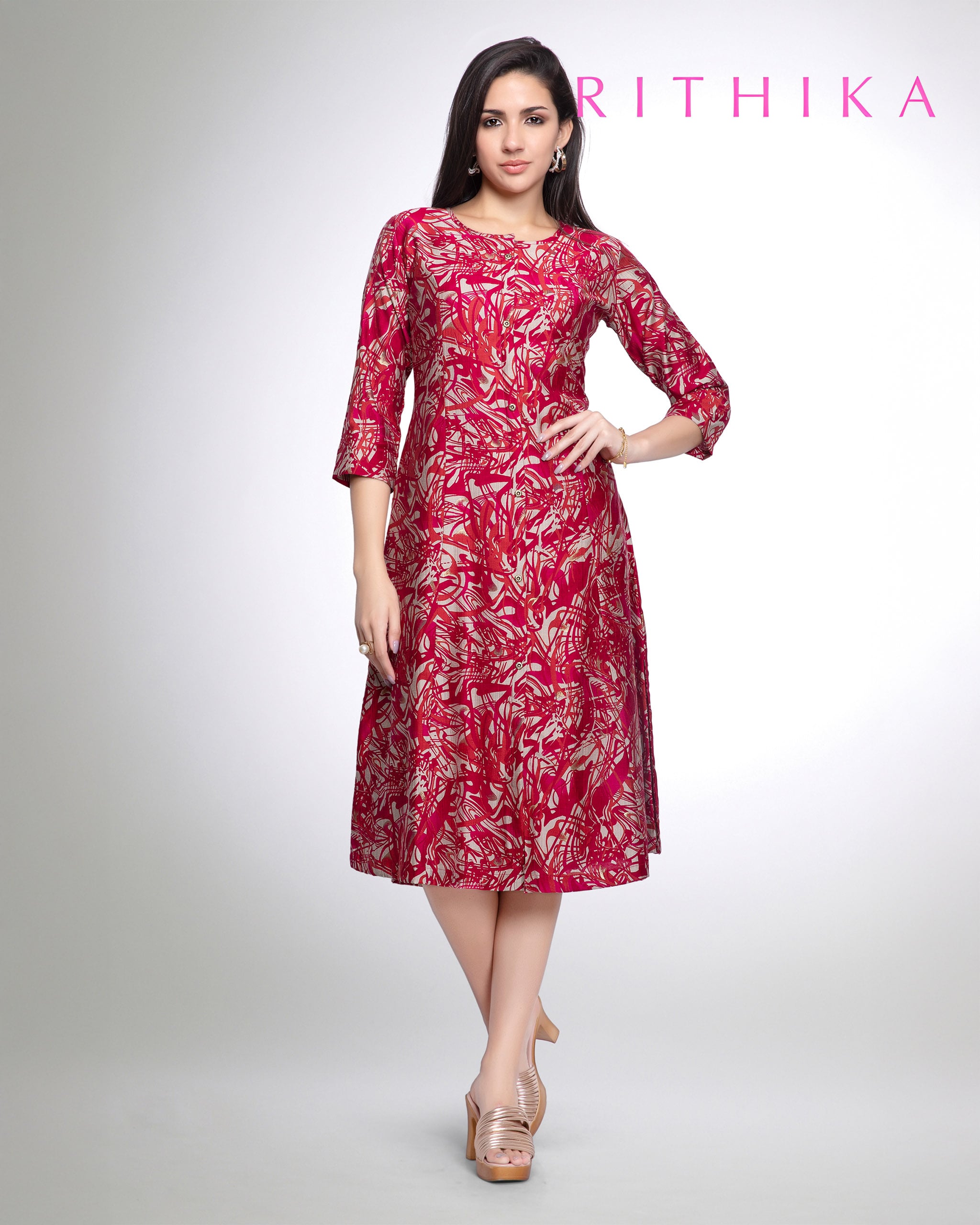 Pink and red A line silk fabric kurti with all over digital print with 3/4th sleeves.