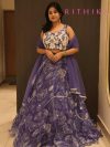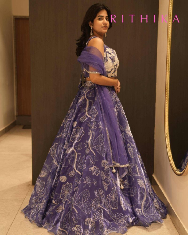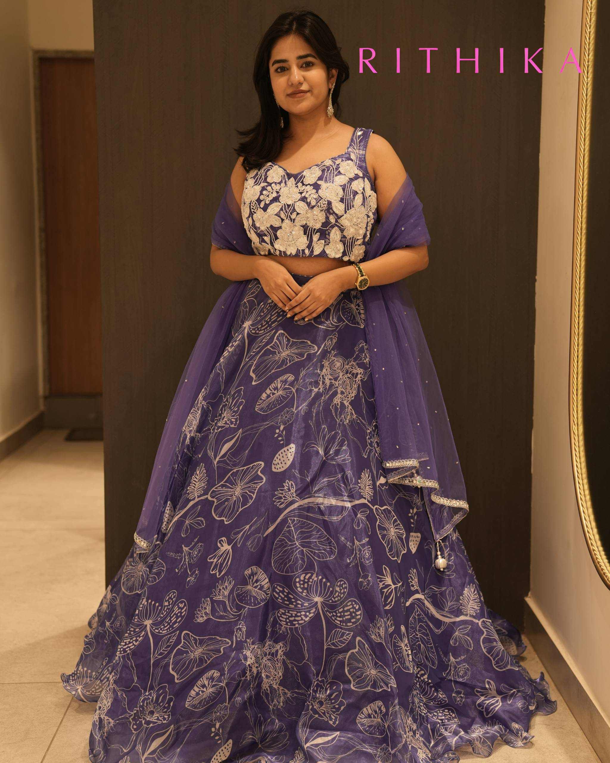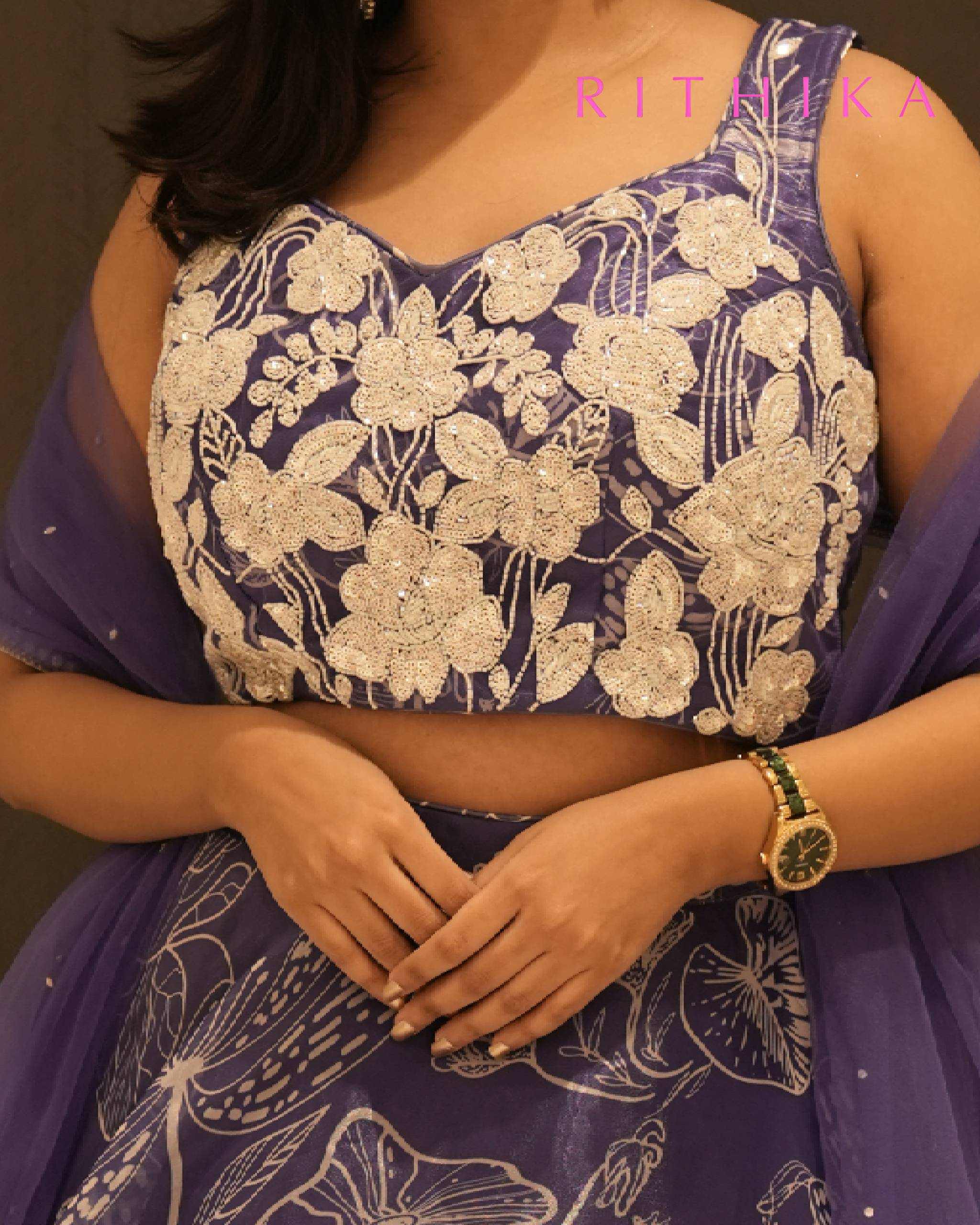 Violet organza silk lehenga with all over floral print, with a beautiful self choli with white cut dana and sequin work net dupatta with 3/4th sleeves.