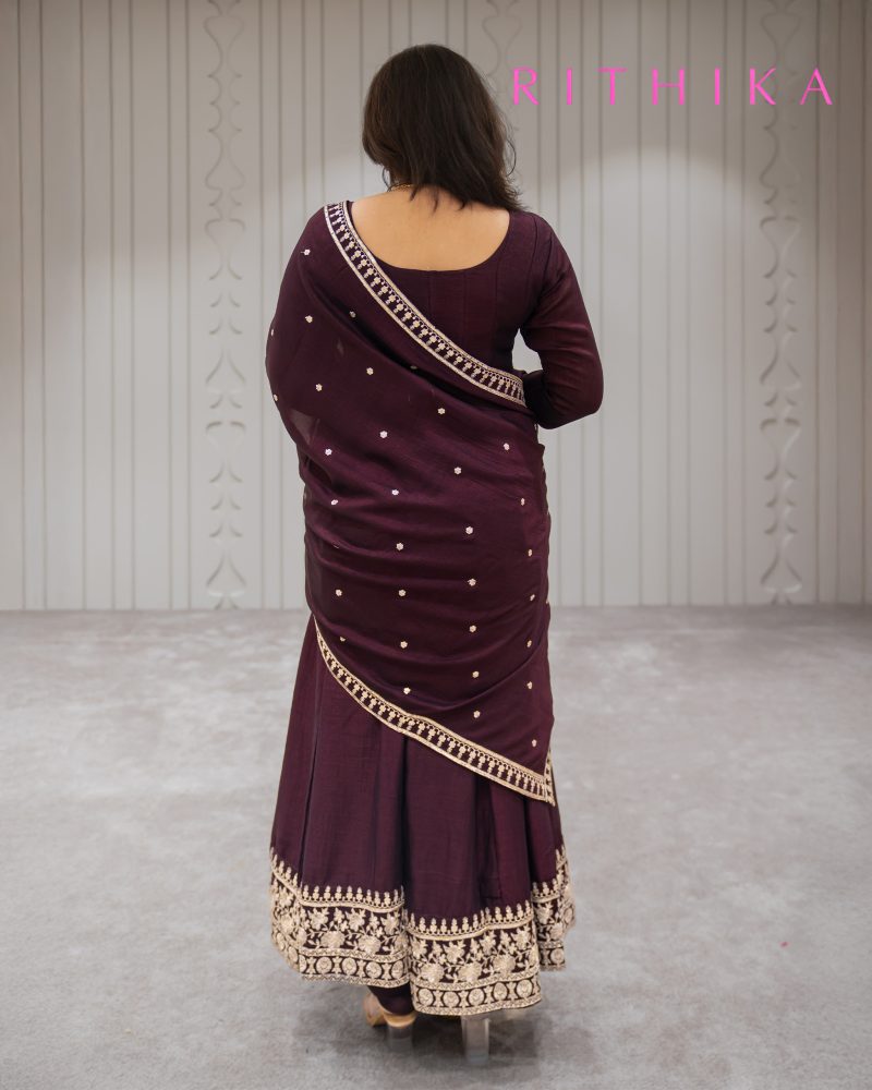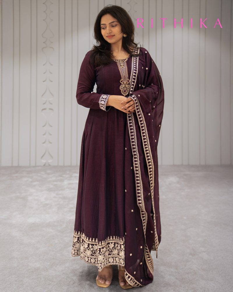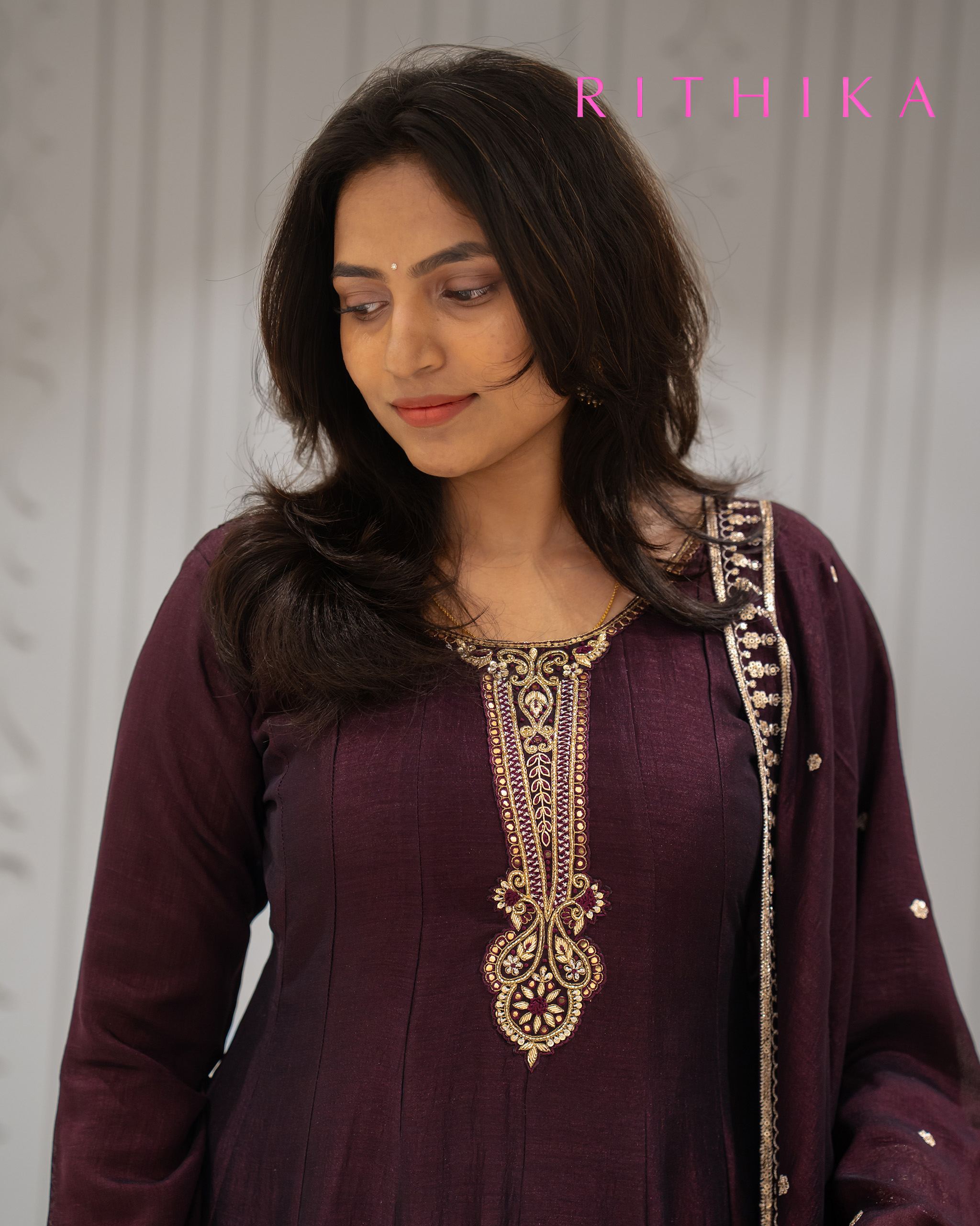 Wine vichitra silk short length anarkali with hand work on the neck, silk straight pants with a silk embroided dupatta with 3/4th sleeves.