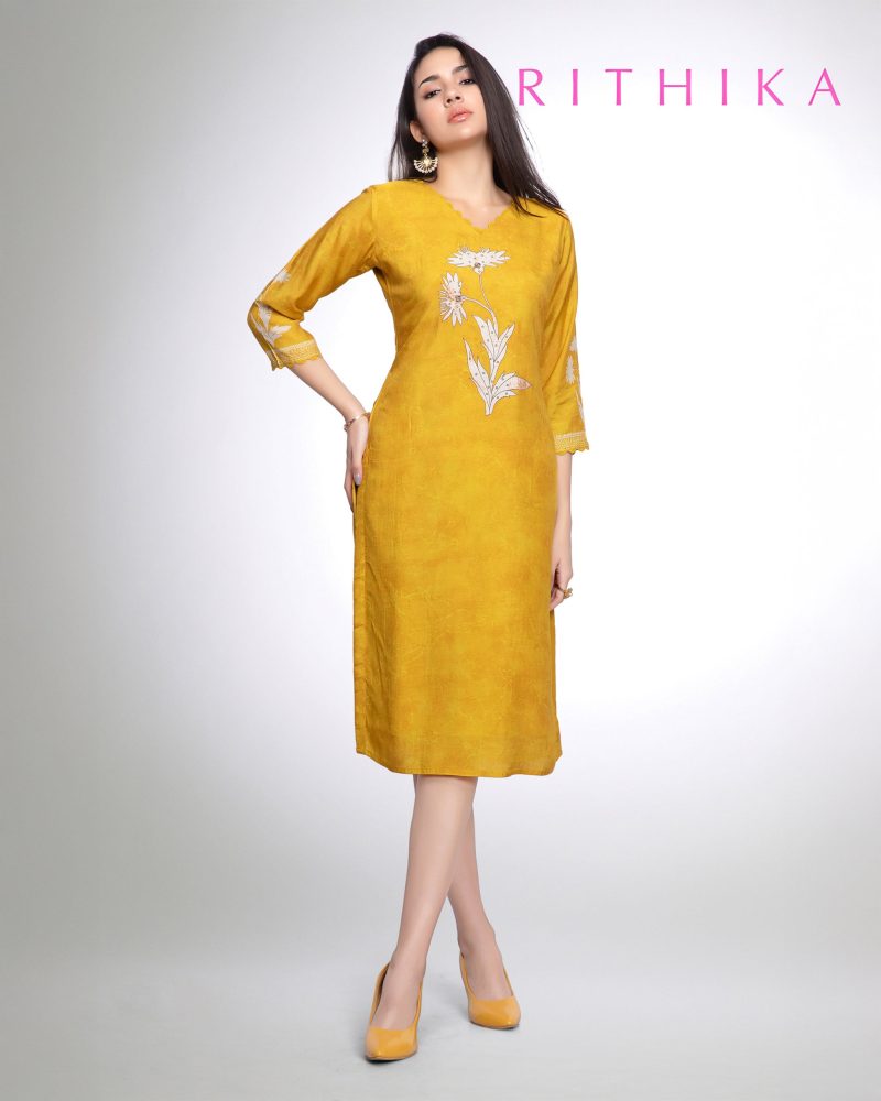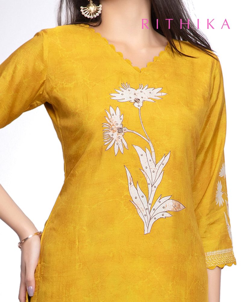 Yellow muslin silk fabric straight cut kurti with cream floral print high lighted with thread and zari work, with 3/4th sleeves with print.